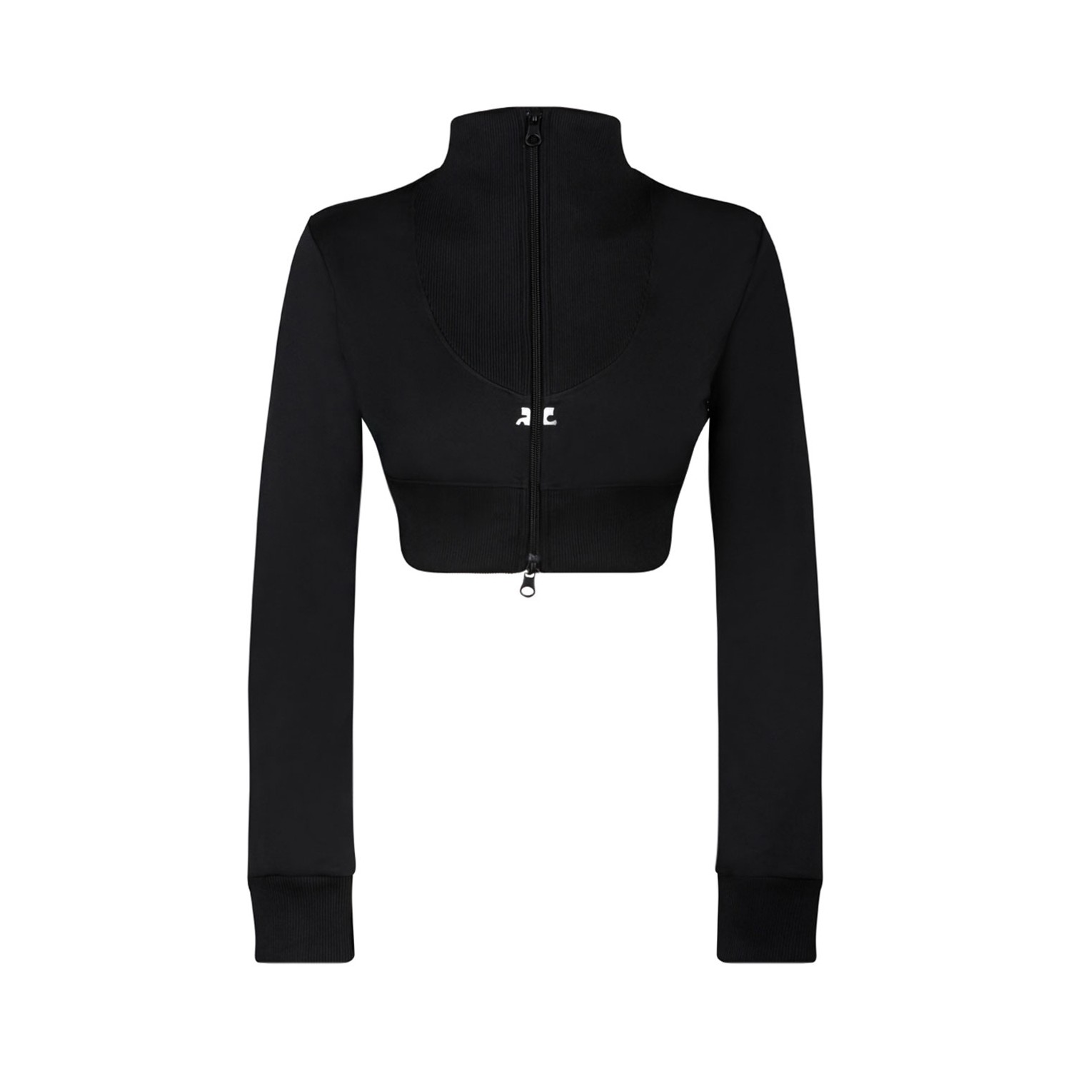 Courreges Black Cropped Tracksuit Jacket. Black tracksuit cropped jacket in jersey fabric has a high ribs collar detail.