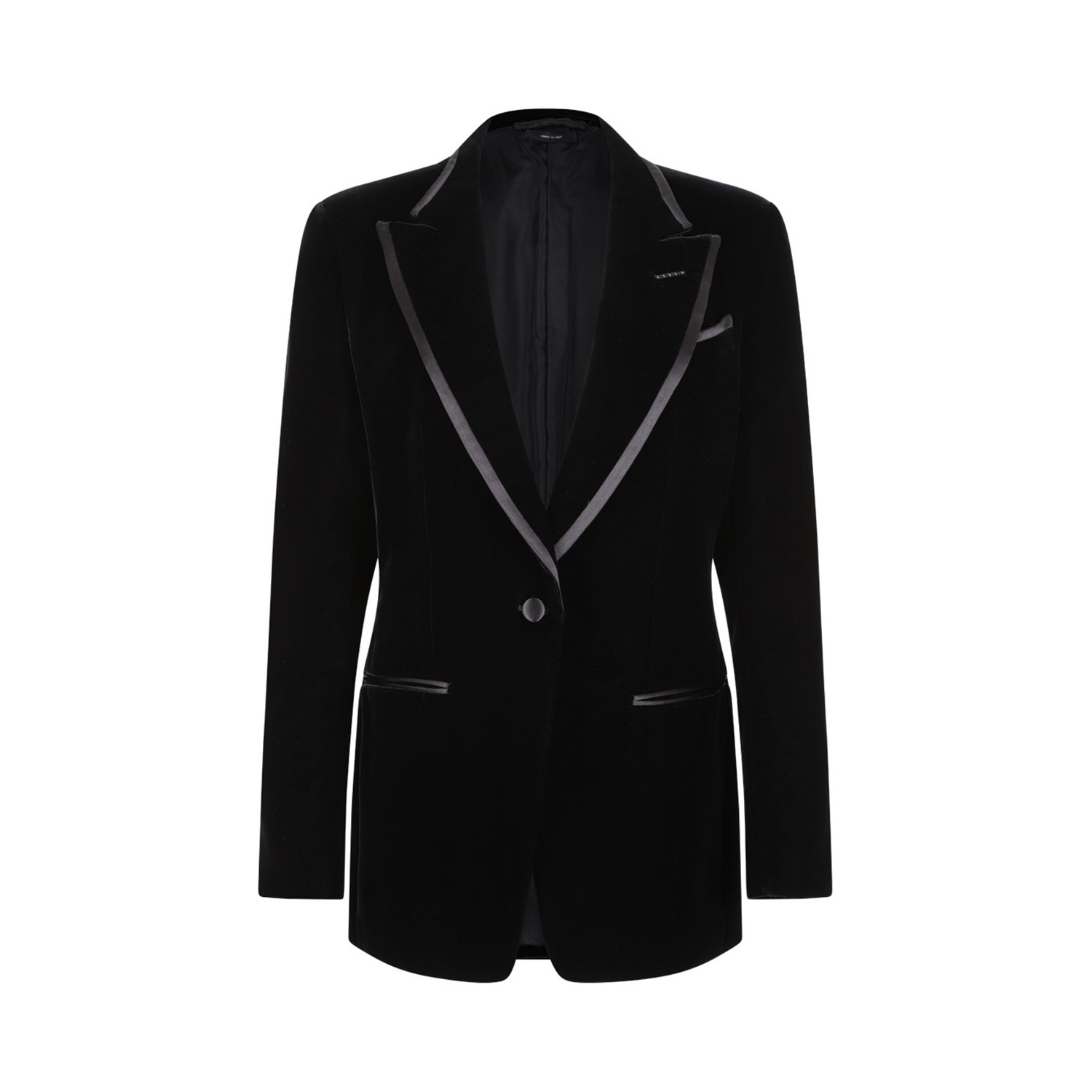 Tom Ford Black Velvet Wallis Single Breasted Tuxedo Jacket. Black single breasted tuxedo peak lapel jacket with barchetta chest pocket, hand made lapel buttonhole. Welt pockets, satin trimmed detailing on front pockets and lapels. Five kissing cuff buttons, Tom Ford design feature a longer first final buttonhole on cuffs, internal pockets. Single vent, covered buttons, fully lined.