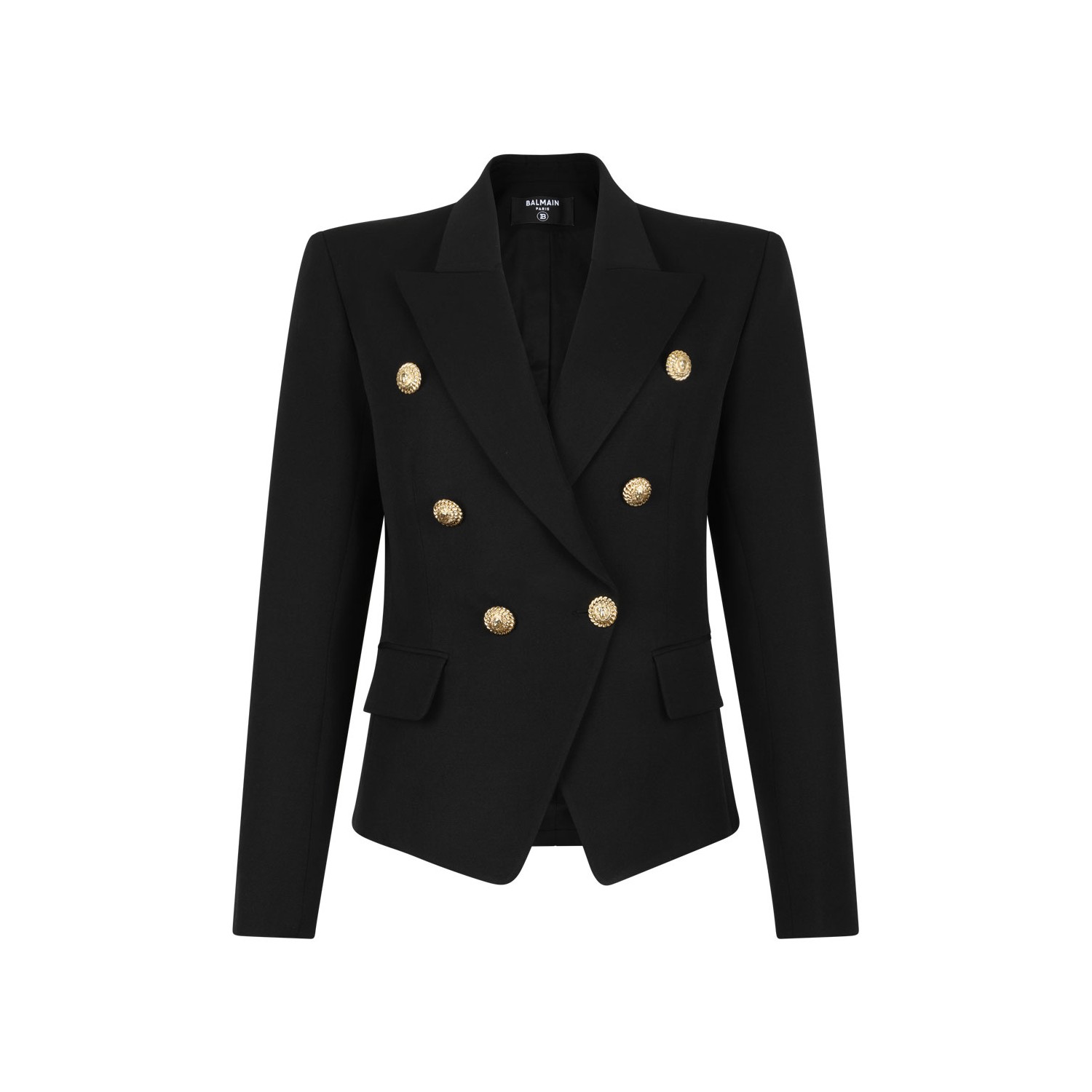 Balmain Black Double-Breasted Wool Jacket. Black wool jacket with double-breasted, gold-tone buttons, peak lapel and long sleeves.
