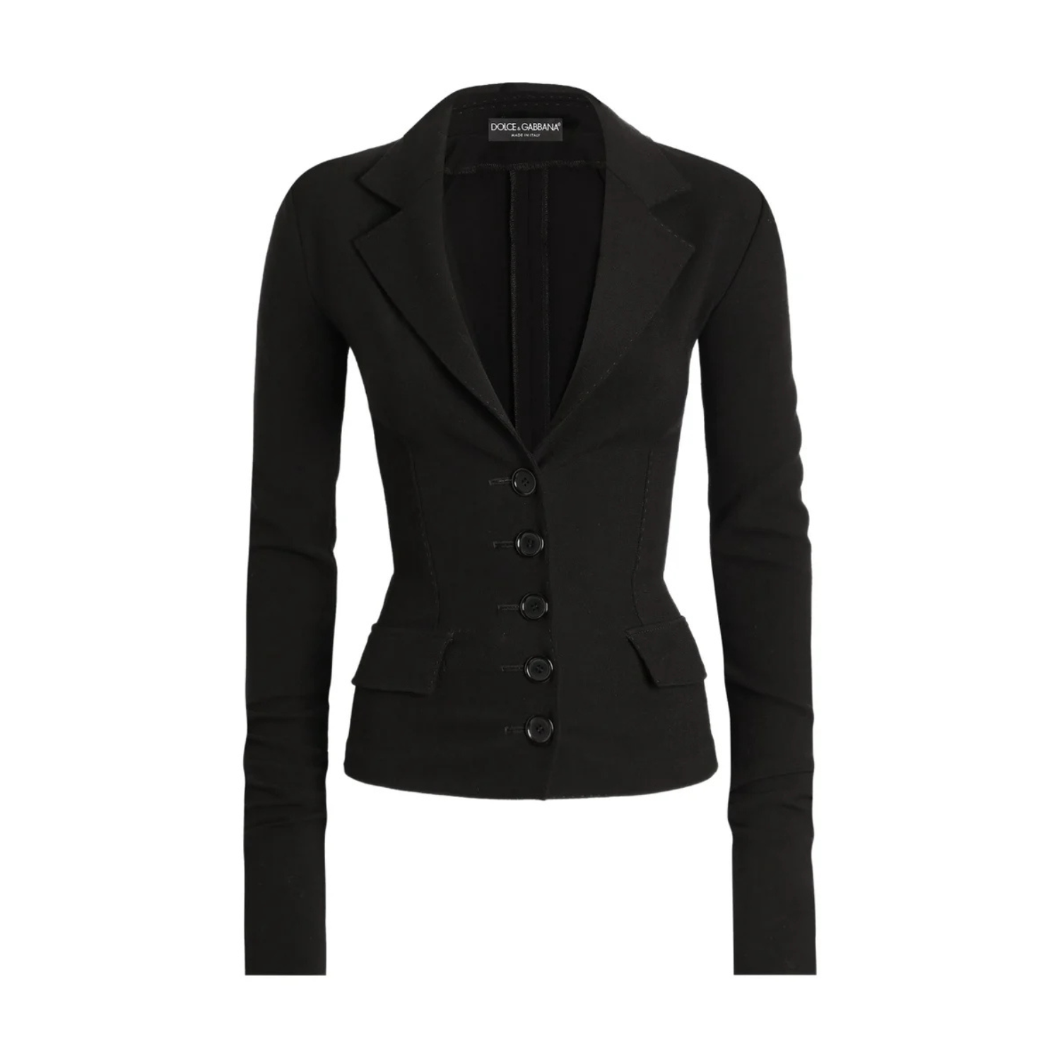 Dolce & Gabbana Black Single-Breasted Wool Jacket. Tailored and feminine, this single-breasted jacket is crafted from structured black wool canvas, designed to enhance the silhouette with a sharply contoured waist. The fitted construction creates a sculpted, corset-inspired effect, while the classic notched lapels add timeless sophistication. Featuring a front button closure and flap pockets, the elongated sleeves emphasize its refined, modern attitude. Elegant and versatile, this jacket perfectly embodies Dolce & Gabbana