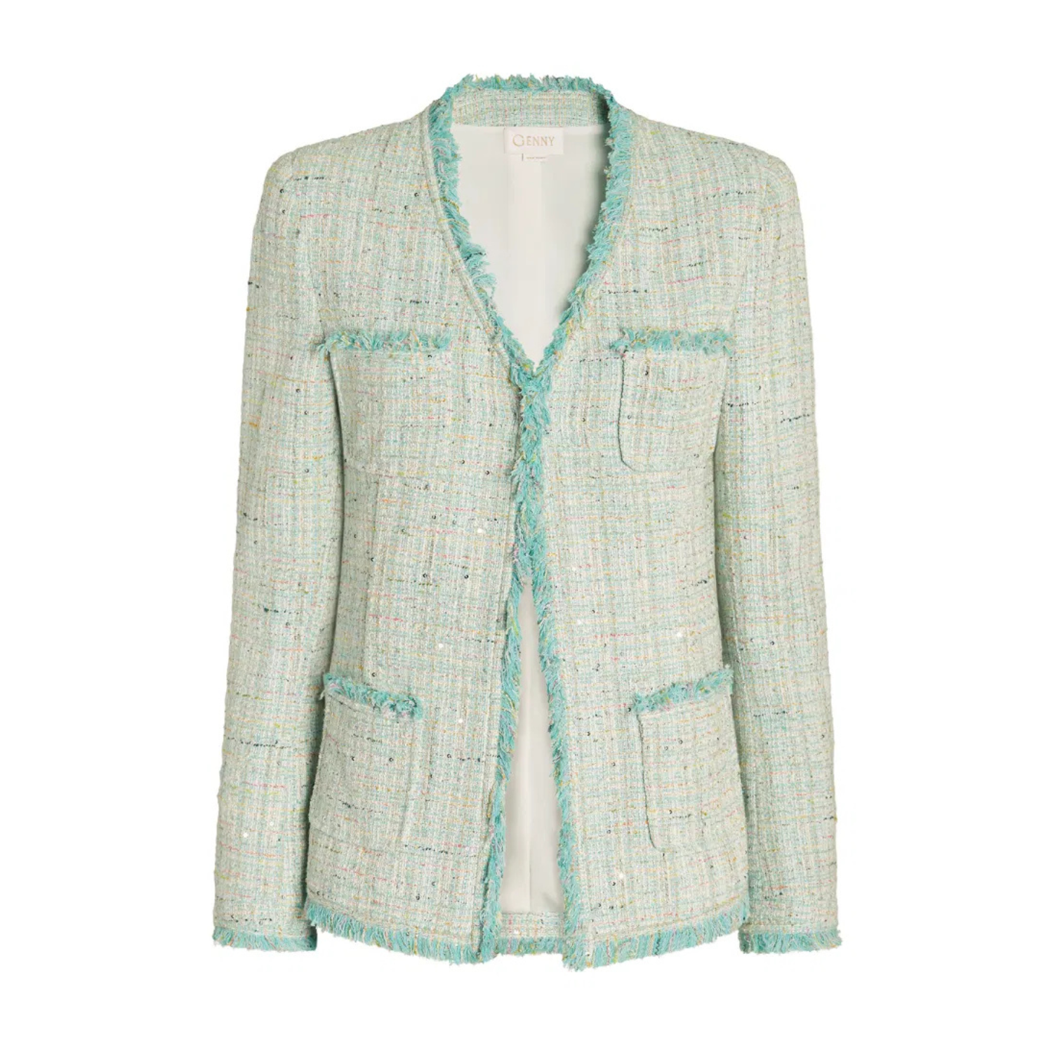 Genny Canal Green Multi-Thread Jacquard Jacket. Multi-thread jacquard jacket with a sophisticated design, featuring a luxurious texture and frayed trims on the edges, pockets, and hem. The front patch pockets and hook closure create a harmonious balance between aesthetics and functionality. A distinctive piece, designed for relaxed, timeless elegance.