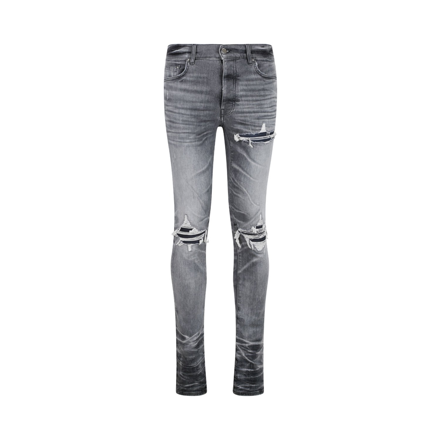 Amiri Grey Tapered Jeans. Grey tapered jeans with striking marbling, uneven shading, as well as bold abrasions and tears, highlights the rebellious spirit inspired by punk and grunge culture. A contrasting lining, purposefully exposed at the tears, emphasizes the sophisticated layering of the design.
