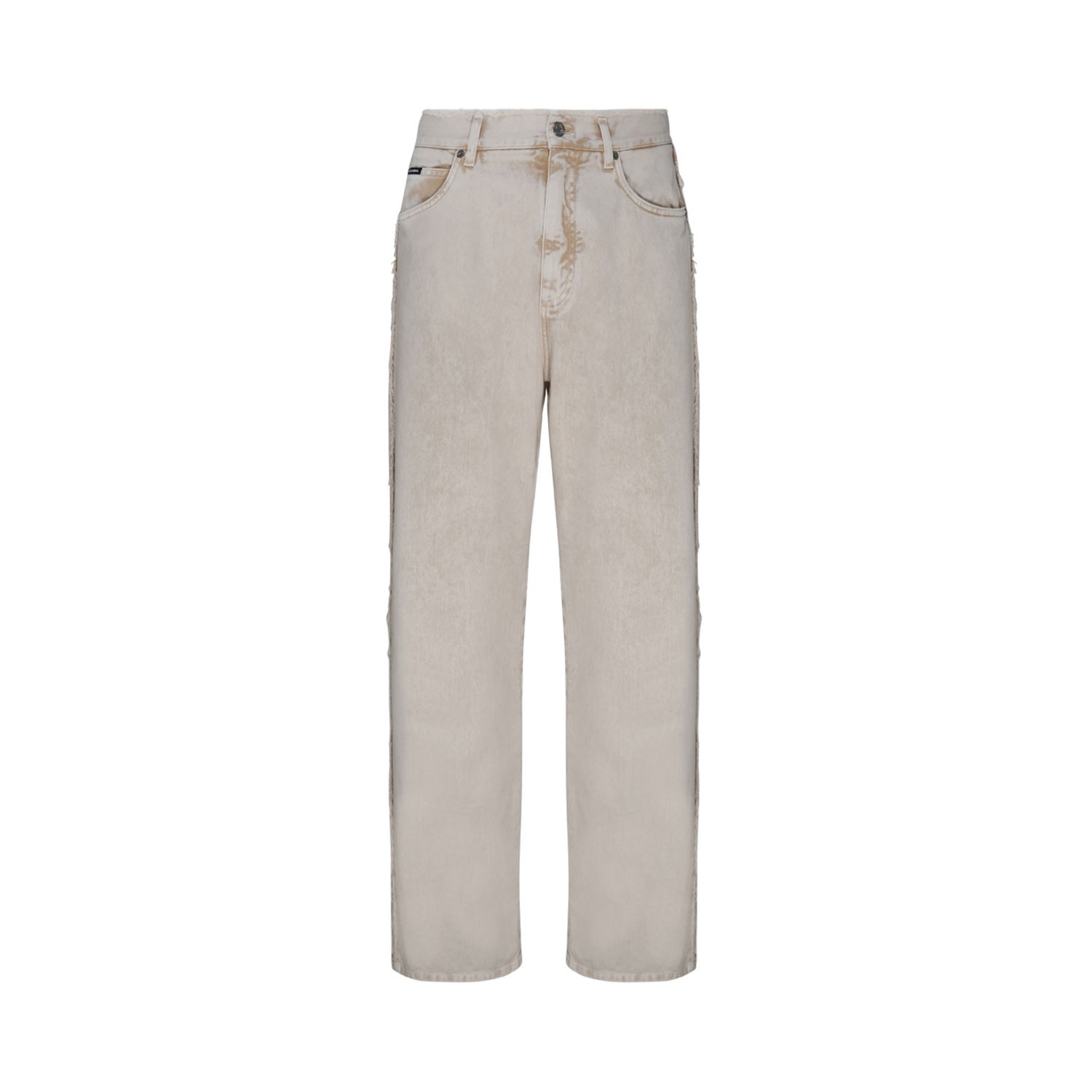 Dolce & Gabbana Light Beige Cotton Frayed Trim Jeans. Light beige cotton jeans, frayed detailing, high waist, belt loops, front button and zip fastening, classic five pockets, gold tone logo plaque, wide leg.