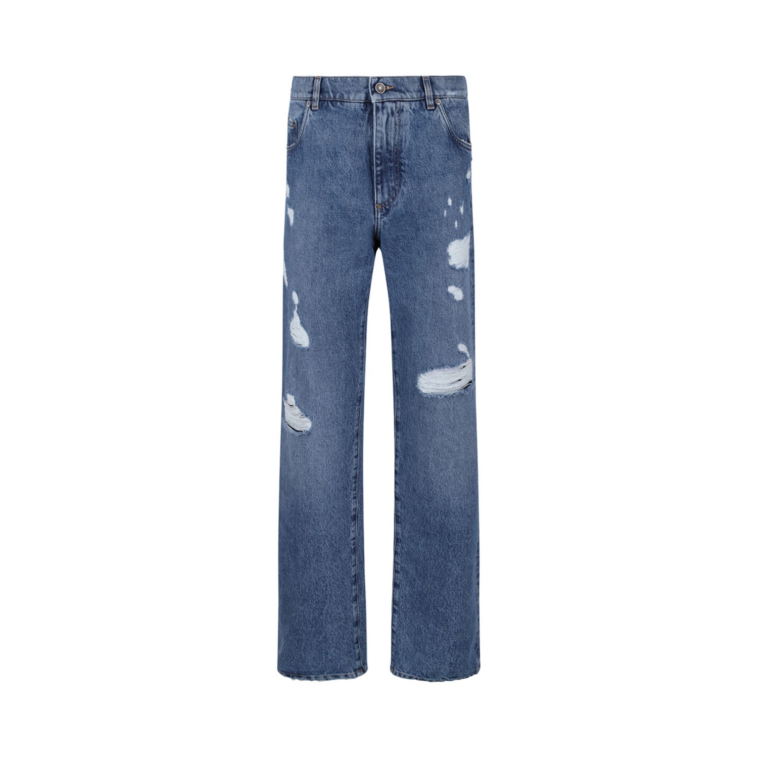 Dolce & Gabbana Blue Ripped Jeans. Straight-leg jeans in blue cotton with front button and zip fastening. Belt loops, five classic pockets, embroidered logo on the back.