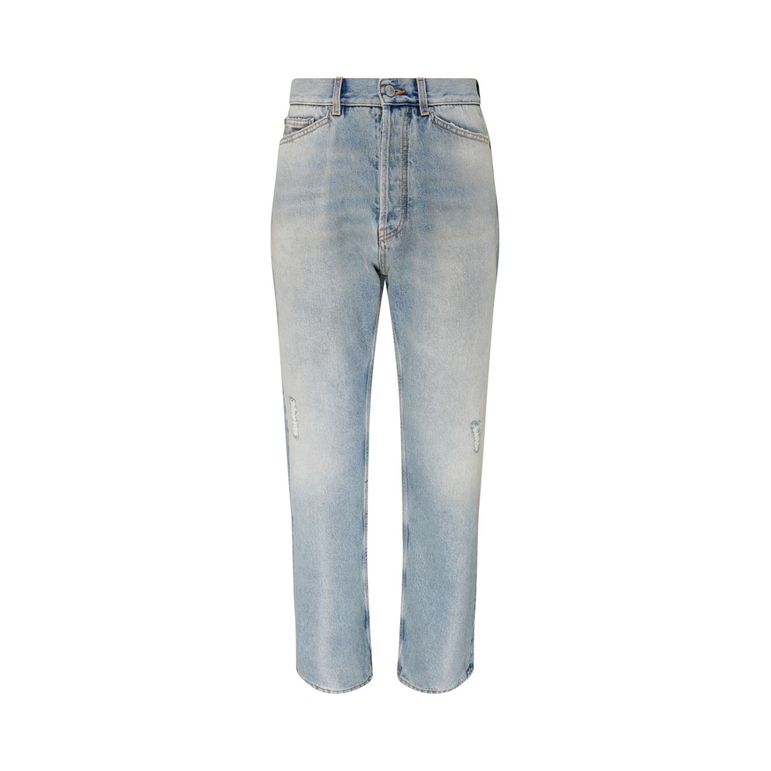 Palm Angels Light Blue Cotton Distressed Denim Jeans. Light blue cotton denim jeans, mid rise, belt loops, front button and zip fastening, classic five pockets, faded effect, distressed finish, straight leg.