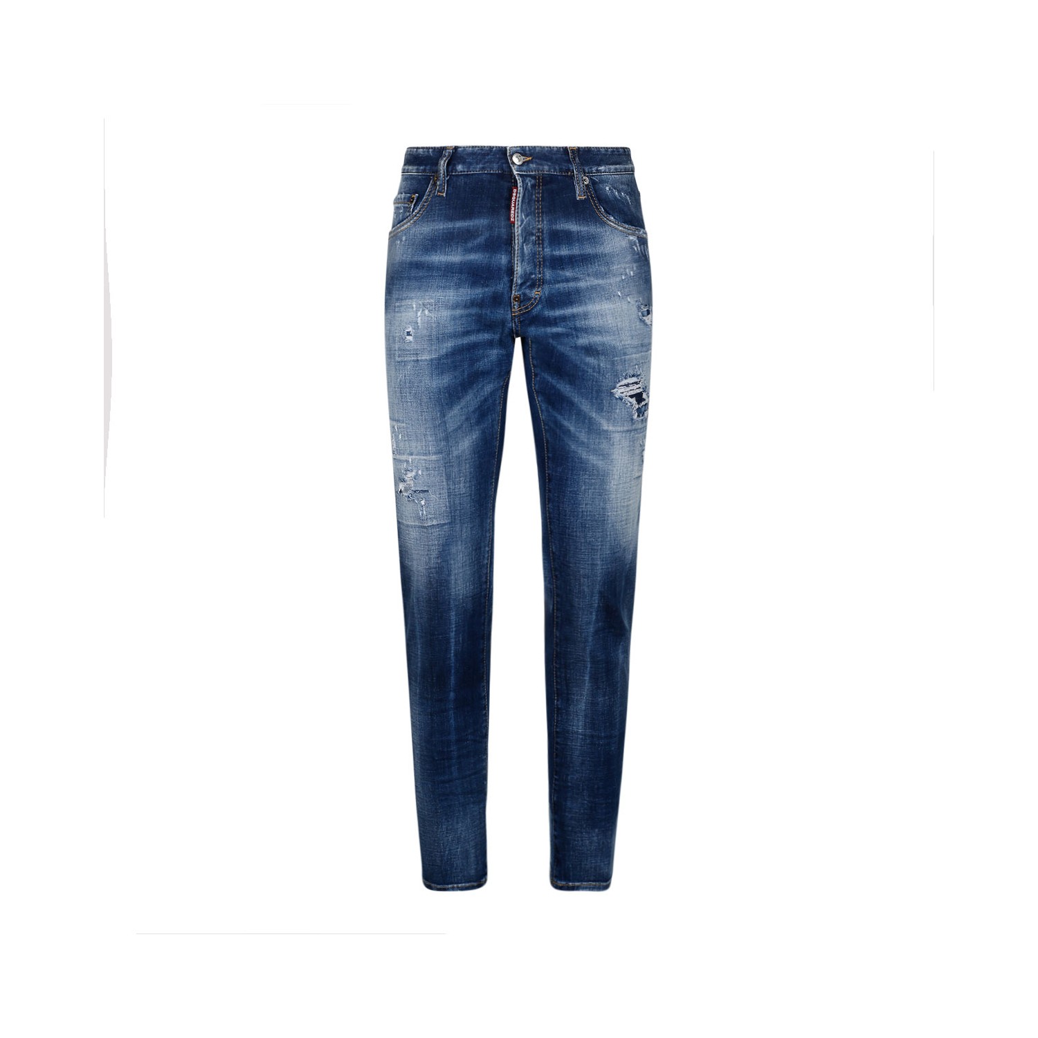 Dsquared2 Navy Blue Denim Jeans. Navy blue cotton jeans, vintage effect, tapered legs, button fastening, classic five pockets, back logo patch.