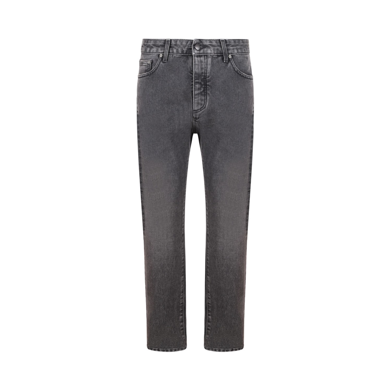 Palm Angels Black and White Logo Print Jeans. Black and white cotton jeans, logo print to the rear, front button and zip fastening. Classic five pockets, belt loops, straight leg and slim cut.