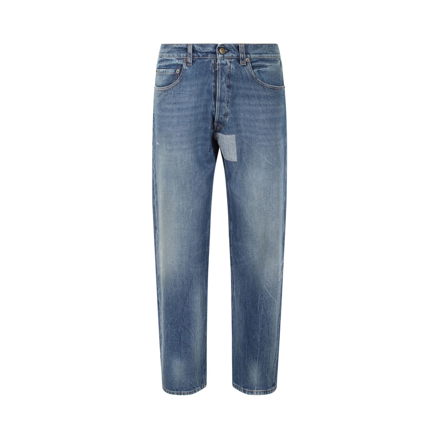 Maison Margiela Vintage Medium Blue Tapered Leg Jeans. Crafted in faded denim with subtle abrasions, these jeans feature a tonal patch at the back that evokes the Maison�s Memory of concept � capturing the trace of what once was. Maison Margiela�s signature, the four stitches, appear at the back the opposite of a label.