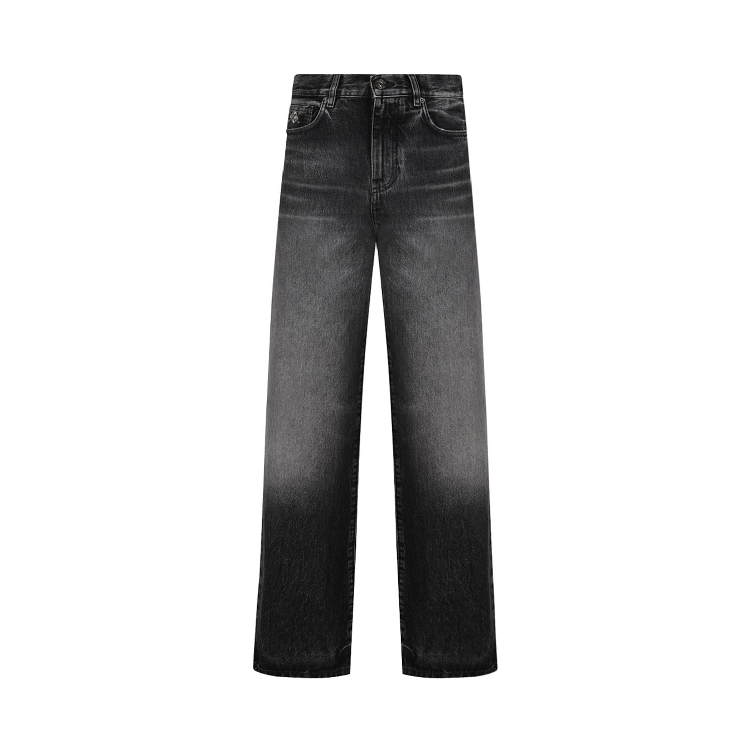Versace Dark Stonewash Finish Loose Fit Jeans. Dark stonewash finish jeans with Medusa Biggie accessory, Versace logo leather application, belt loops. Front closure with zip and button, five-pocket model.