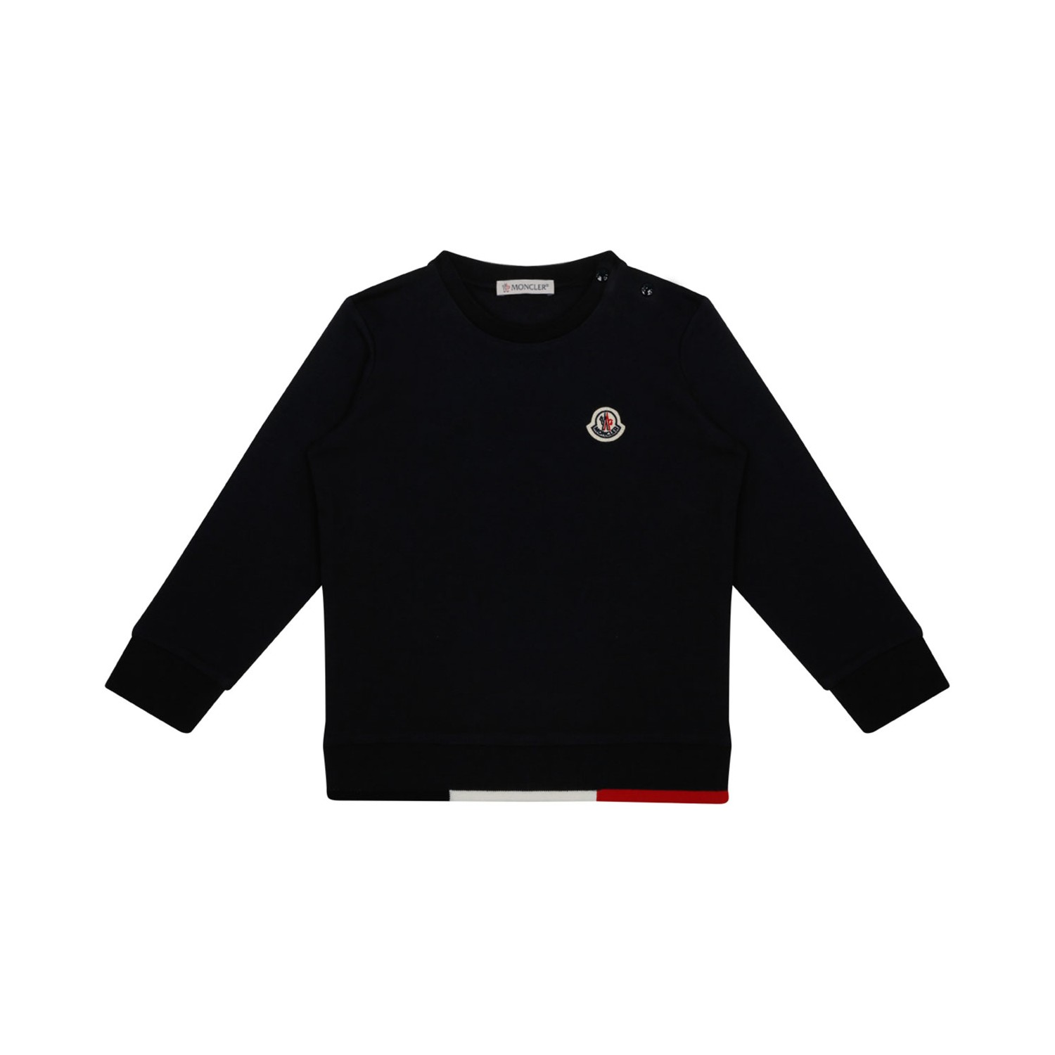 Moncler Baby Jumpsuit Set. Baby jumpsuit set with logo patch on chest and tricolor bottom. Snap button closure at shoulder. Ribbed crew neck hem and cuffs. Tri-color patterned bottom and logo patch on chest. Elasticized waistband and pouch pocket at front.