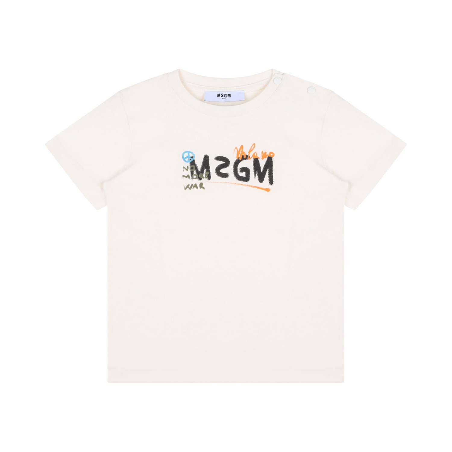 MSGM Kids White and Black Sports Set. White and black sports set composed of a white t-shirt with short sleeves, crew neck and logo print to the front. Black shorts with logo print to the side.