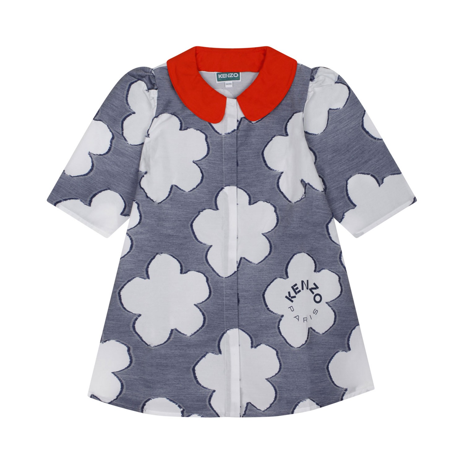 Kenzo Kids Navy Blue and Orange Floral Print Dress. Navy blue and orange cotton blend dress, all over floral print, logo print to the front, detachable collar, concealed front button fastening, short sleeves and straight hem.