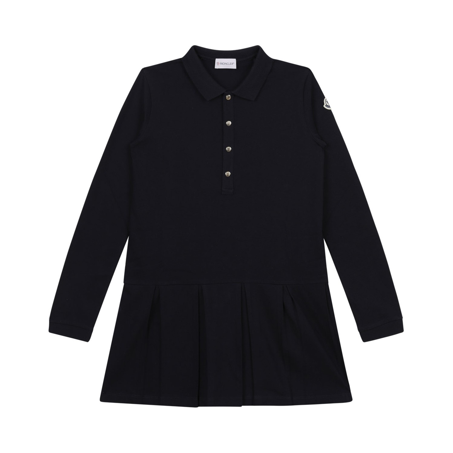 Moncler Enfant Dark Blue Dress. Dark blue dress, front button fastening, shirt collar, logo patch to the sleeve, long sleeves.