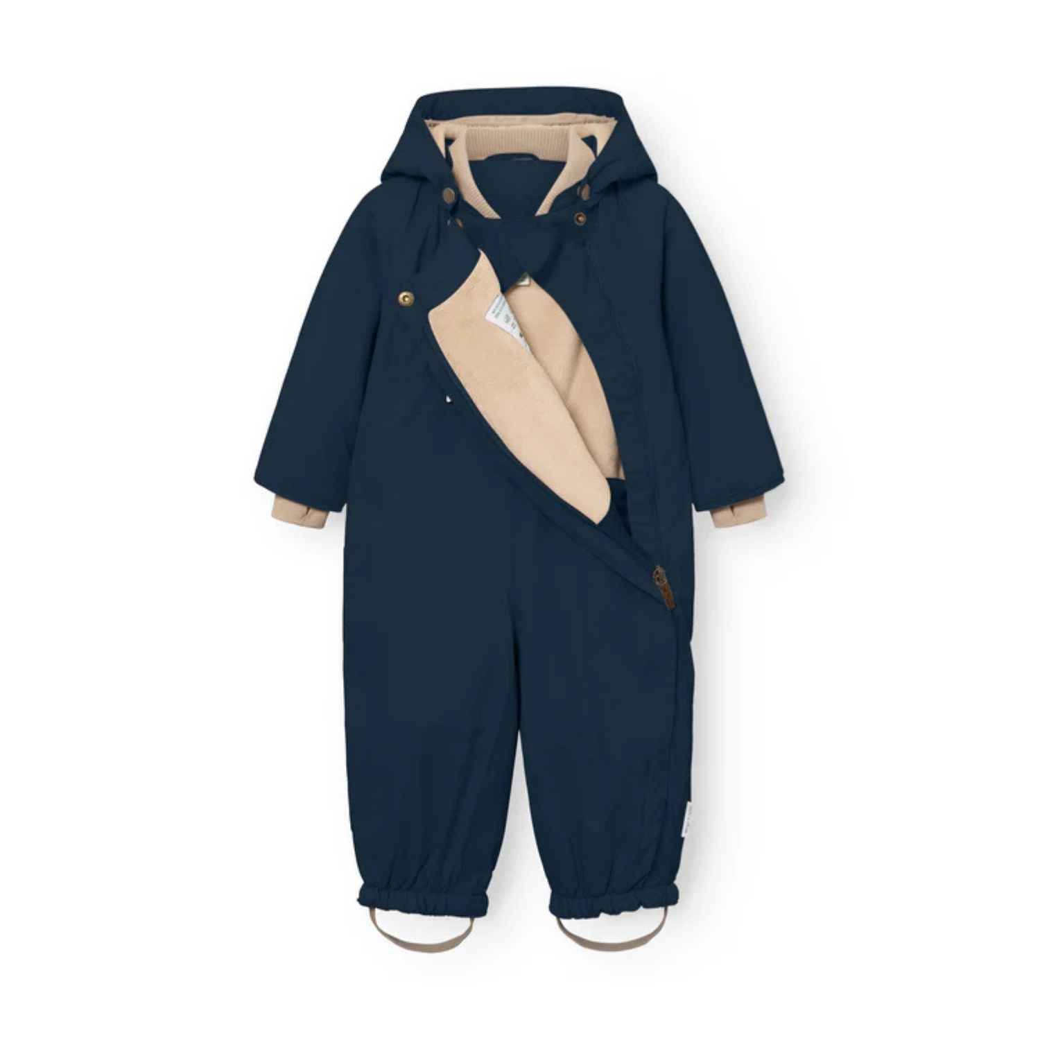 Mini A Ture Outer Space MATWISTI Fleece Lined Snowsuit. Outer space iconic and award-winning snowsuit with wind- and waterproof, breathable, and tested to keep warm down to -25 degrees Celsius. The snowsuit has soft, warm fleece lining, and opens at the front by two hidden, slanted zippers. The hood is detachable and can be adjusted by an elastic string to keep the wind out. The waist can be adjusted from the inside. Snow cuffs at the wrist with thump opening and adjustable waist from the inside. Sizes up to and including size 86 cm (18m) have a rib around the neck, while the larger sizes have a regular collar. MINI A TURE signature reflex star in the front pocket.