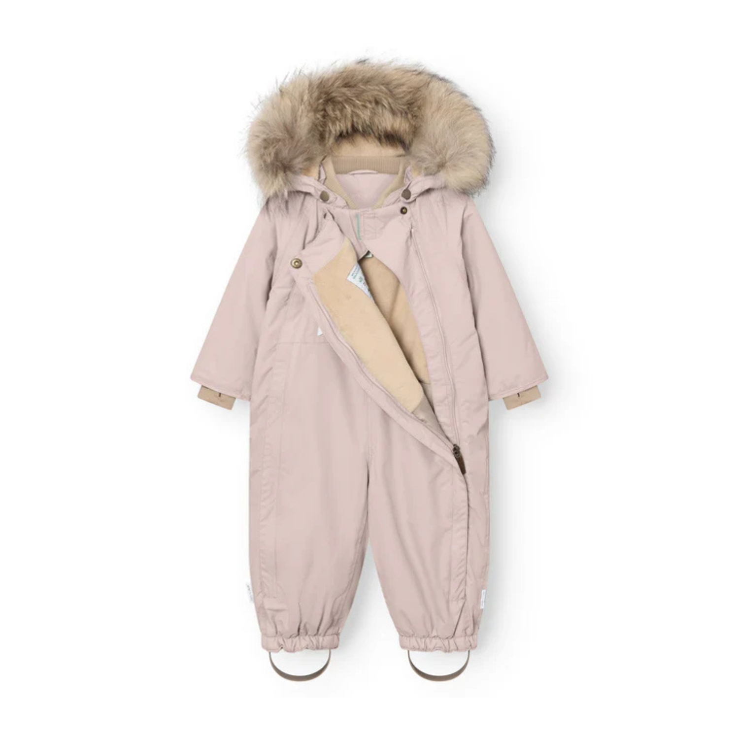 Mini A Ture Cloudy Rose MATWISTI Fleece Lined Snowsuit Fur. Cloudy rose iconic and award-winning snowsuit with wind- and waterproof, breathable, and tested to keep warm down to -25 degrees Celsius. The snowsuit has soft, warm fleece lining, and opens at the front by two hidden, slanted zippers. The hood is detachable and can be adjusted by an elastic string to keep the wind out, and the real fur can easily be removed by a hidden zipper. The waist can be adjusted from the inside. Snow cuffs at the wrist with thump opening and adjustable waist from the inside. Sizes up to and including size 86 cm (18m) have a rib around the neck, while the larger sizes have a regular collar. MINI A TURE signature reflex star in the front pocket.