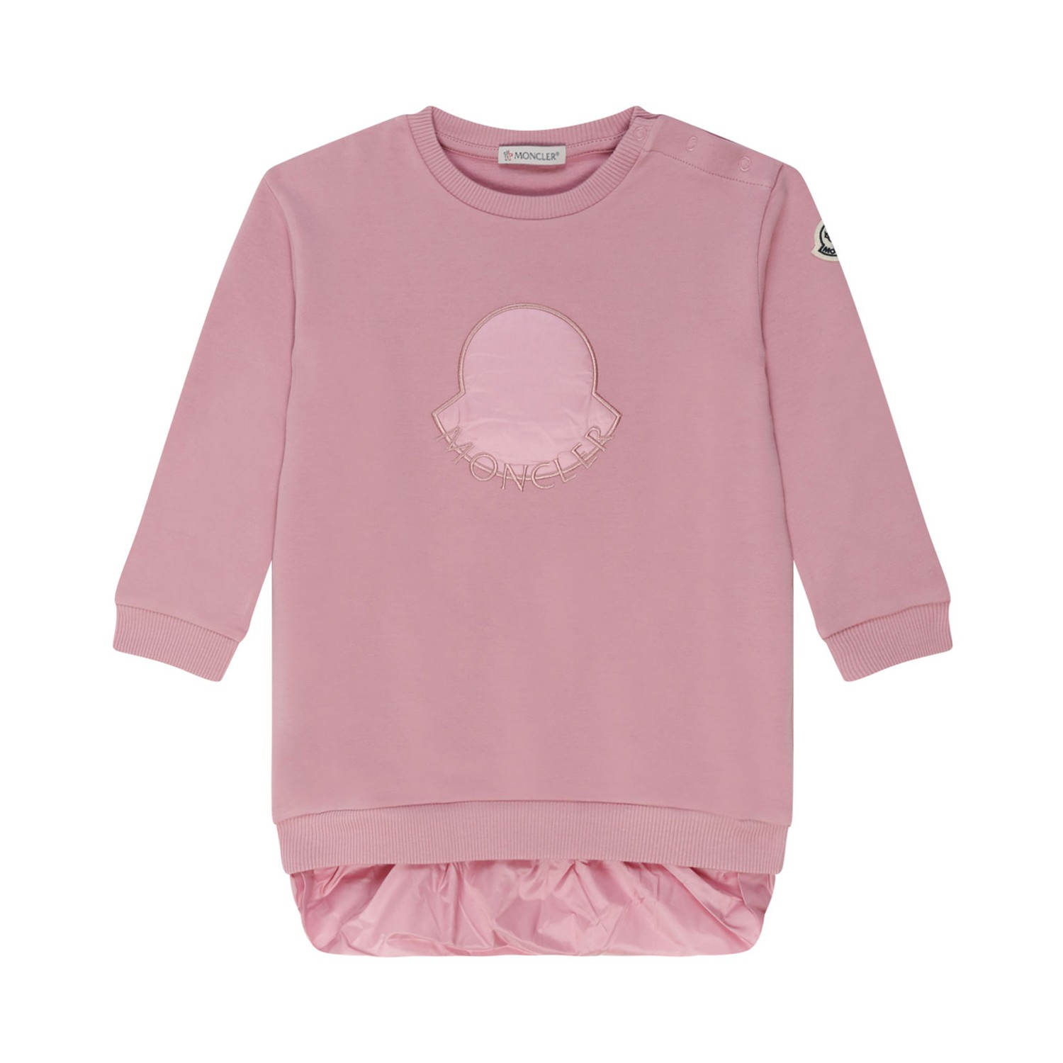 Moncler Enfant Pink Cotton Logo Embroidered Dress. Pink cotton dress, embroidered logo to the front, logo patch at the sleeve, crew neck, button fastening at the shoulder, layered details, ruched detailing, long sleeves, drop shoulder, ribbed cuffs and curved hem.