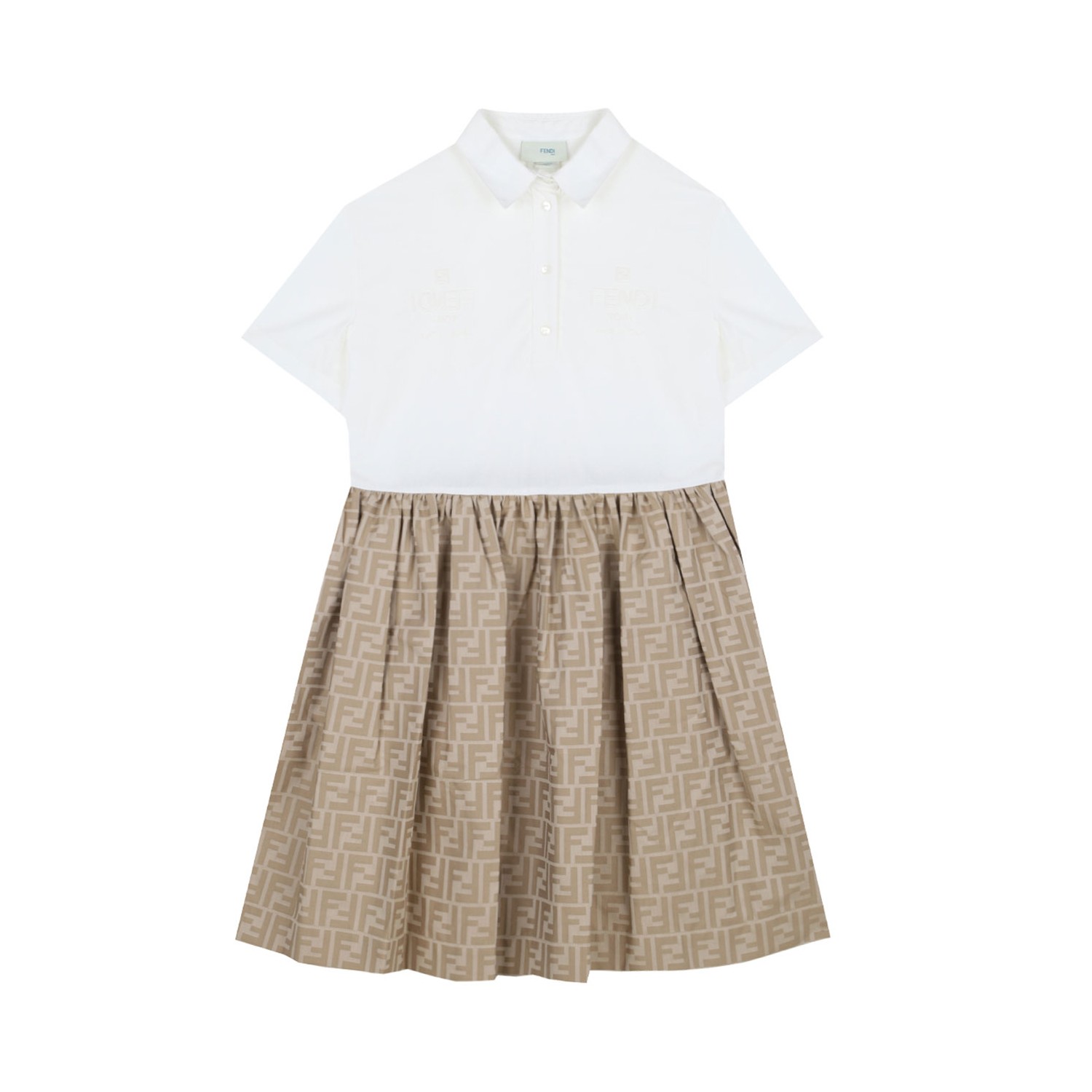 Fendi Kids Beige And White Dress. Beige and white dress with white poplin top and buttons. Beige cotton jacquard skirt with tone-on-tone allover FF logo.