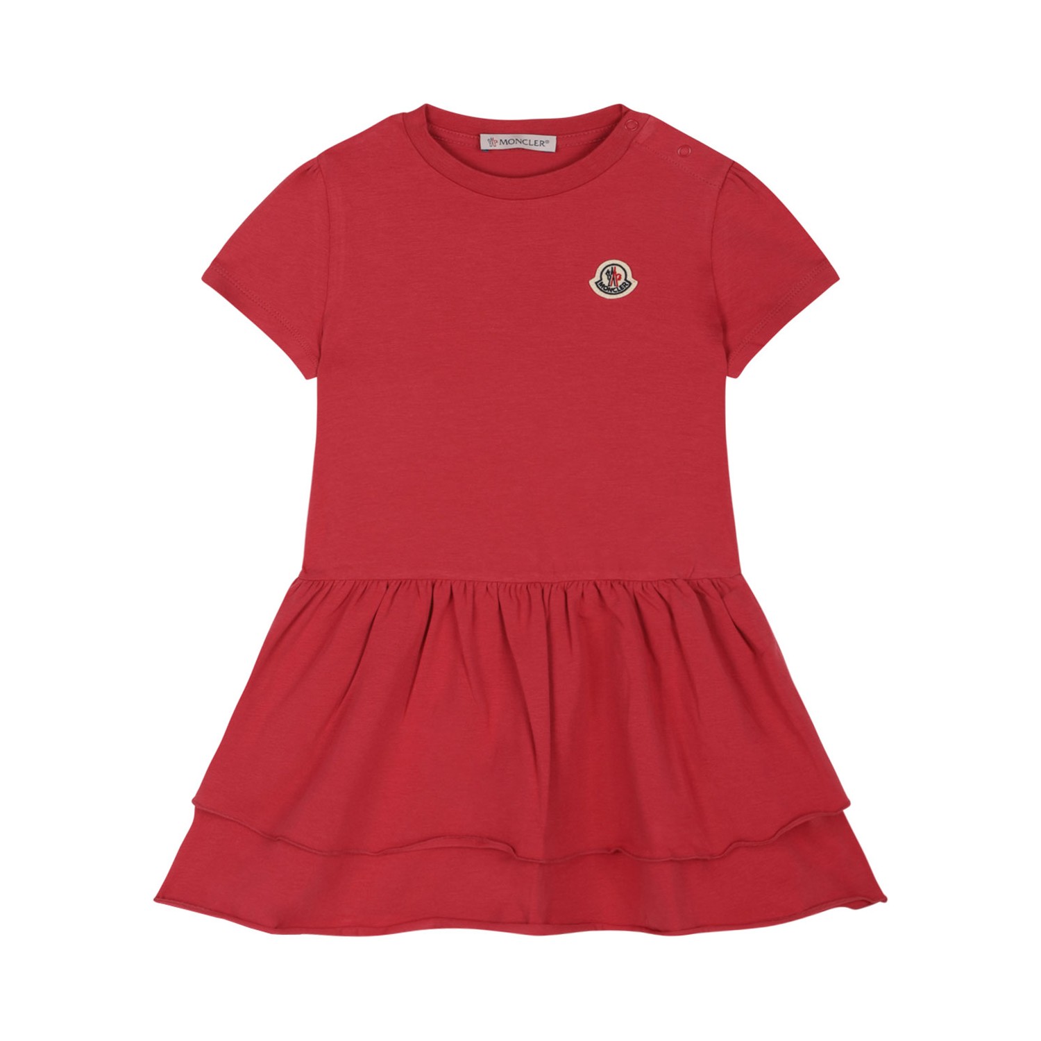 Moncler Enfant Ruby Pink Dress. Ruby pink cotton dress with press-stud fastening at the shoulder, logo patch at the chest, crew neck, tiered skirt.