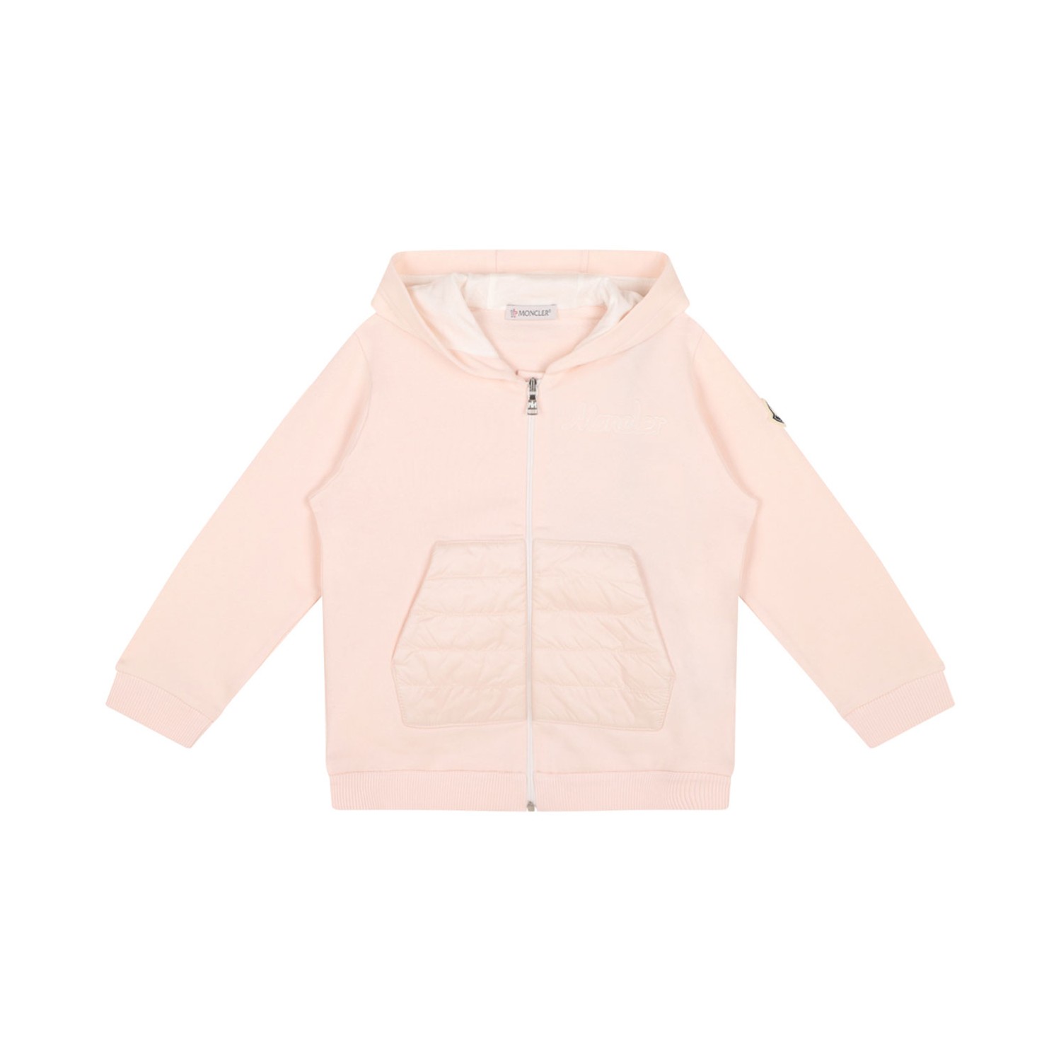 Moncler Enfant Light Pink Hooded Tracksuit. Light pink cotton track suit with front zip fastening, two front pouch pockets, elasticated waistband, ribbed ankles.