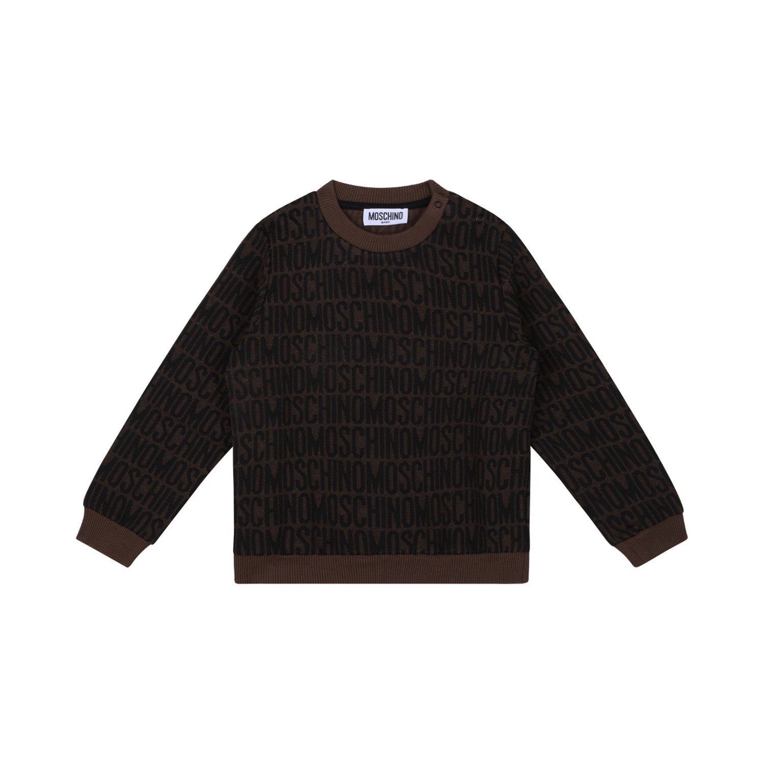 Moschino Kids Coffee Brown and Black Tracksuit With Jacquard Logo. Coffee brown and black tracksuit consisting of a two-piece set comprising a top and trousers. The top has a snap button closure on the shoulder, jacquard motif with logo, chocket, long sleeves and ribbed finish. The pants are characterised by jacquard motif with logo, ribbed waistband, tapered leg, ribbed cuffs.