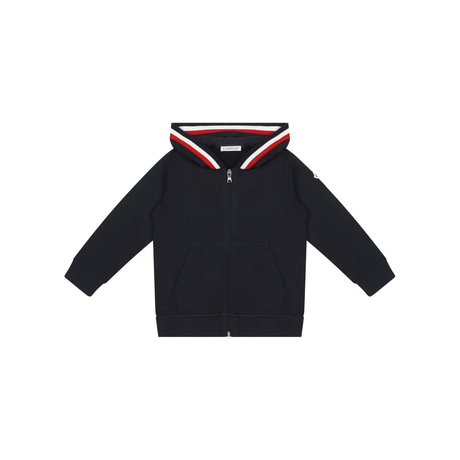 Moncler Kids Navy Blue Tracksuit Set With Tricolor Trim. This navy blue tracksuit set is crafted from soft stretch cotton jersey, a tricolor trim along the hood completes the look. The hoodie features a cotton jersey lining, a zip closure and a kangaroo pocket. The pants feature and elasticated waist and side pockets. Ribbed cuffs and hem.