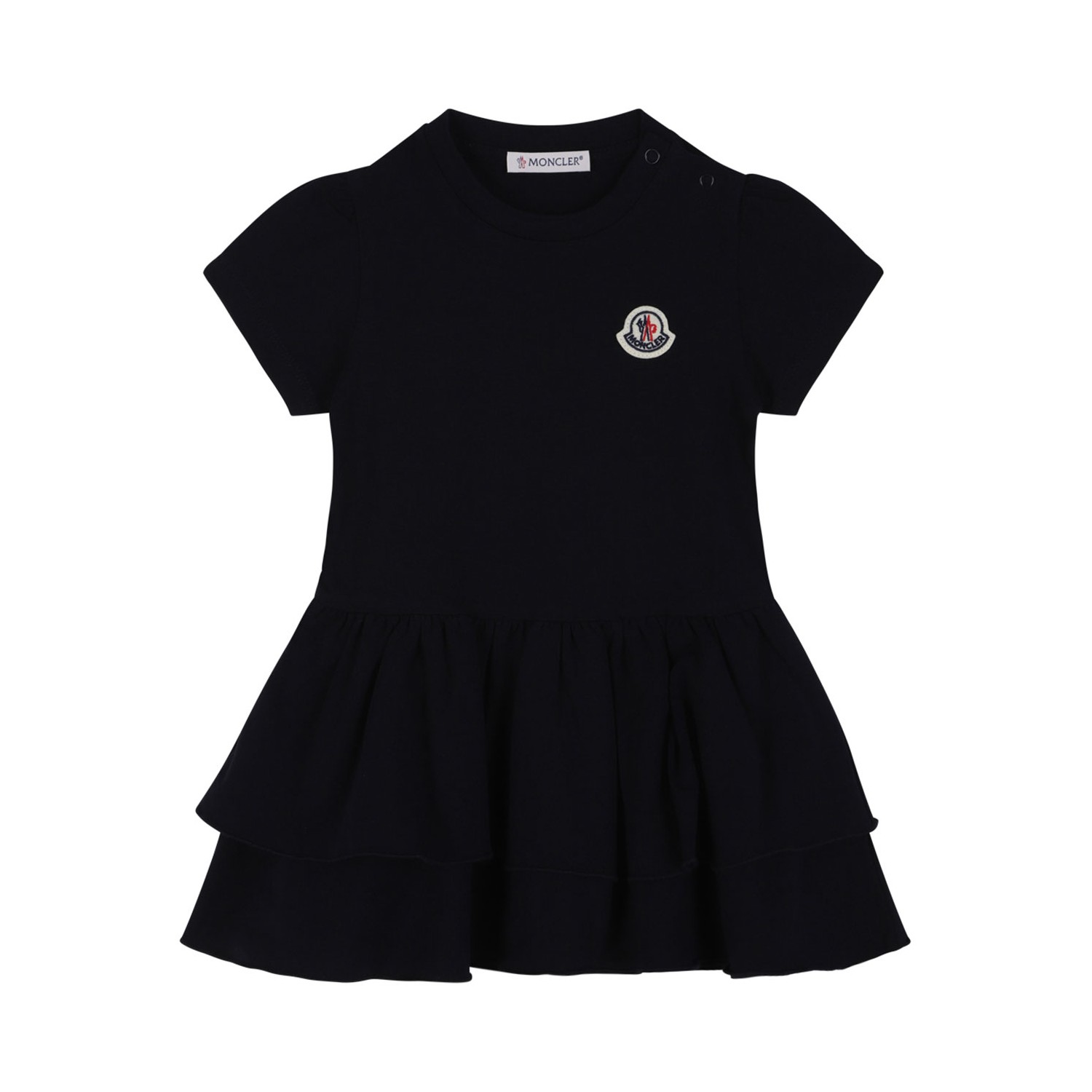 Moncler Kids Navy Blue Flared Dress. Navy blue stretch cotton dress with crew neck, logo patch on the front, wide skirt. short sleeves, button closure.