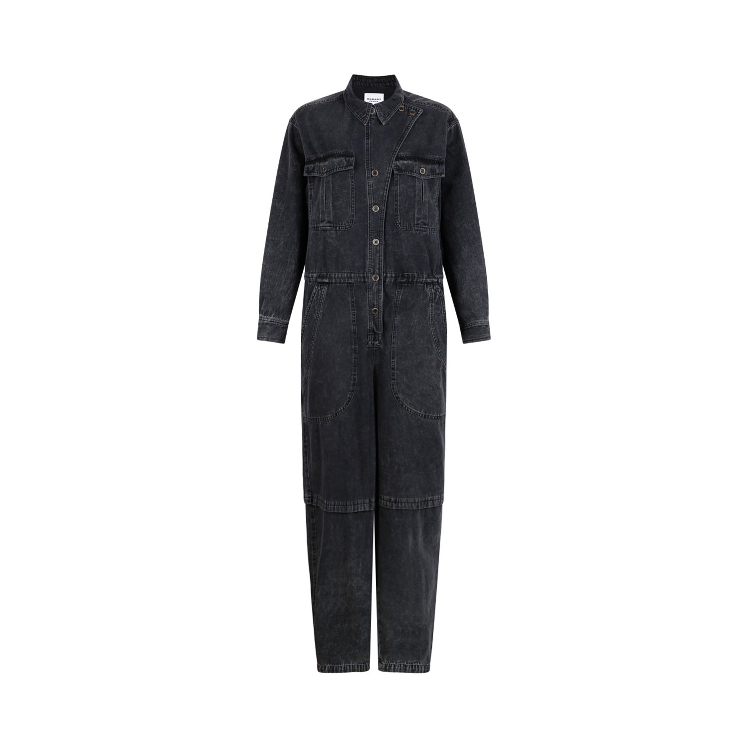 Isabel Marant Black Nadia Denim Jumpsuit. Black cotton denim jumpsuit with shirt collar, button fastening, pockets with button flap. Long sleeves, straight buttoned cuffs, drawstring waist and Italian side pockets.