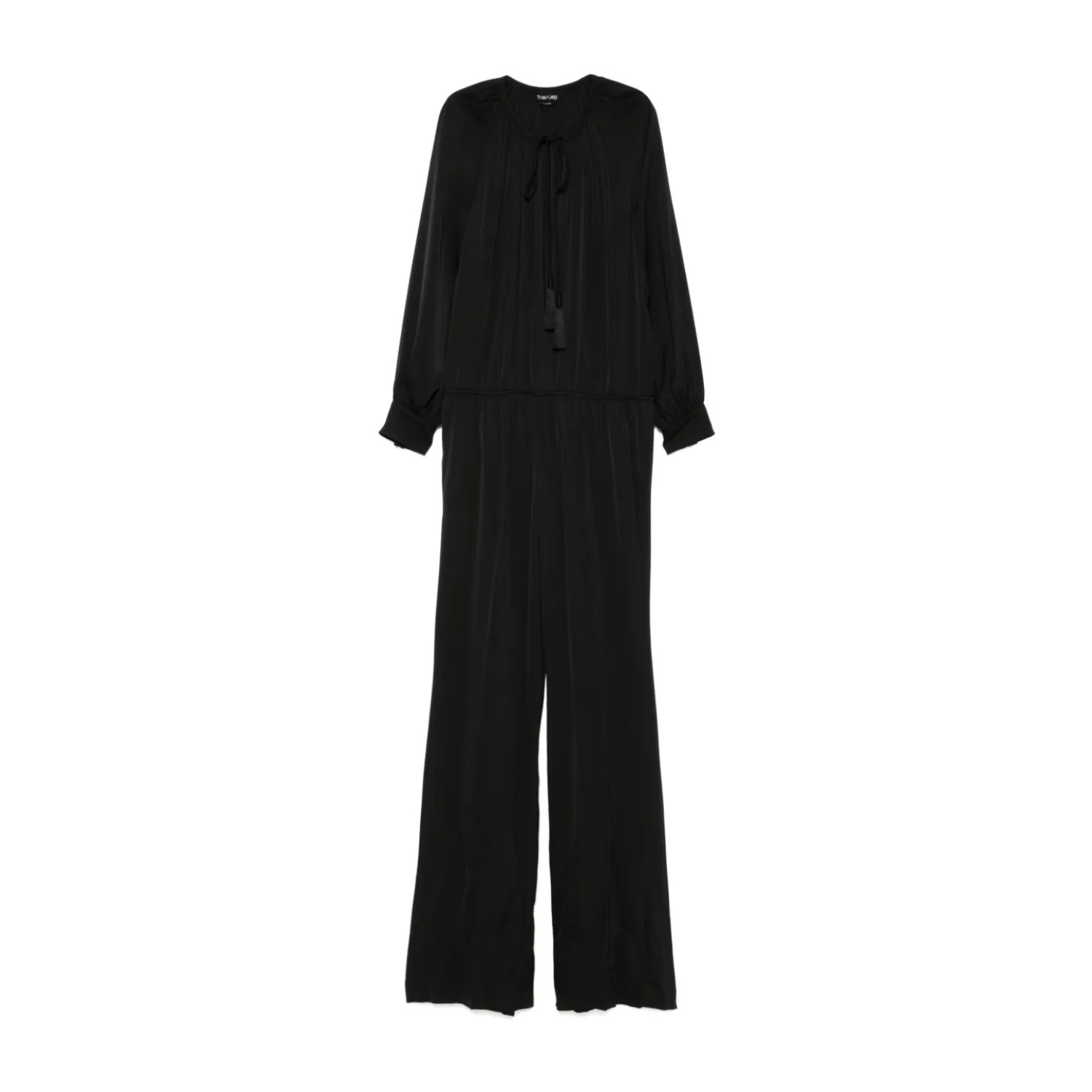 Tom Ford Black Jumpsuit. Black silk jumpsuit with long raglan sleeve, flated pant fit, slanted side pocket. Elasticated waist, deep soft gathered neckline. Gathered cuffs with covered buttons and drawstrings with tassel at neck for closure.