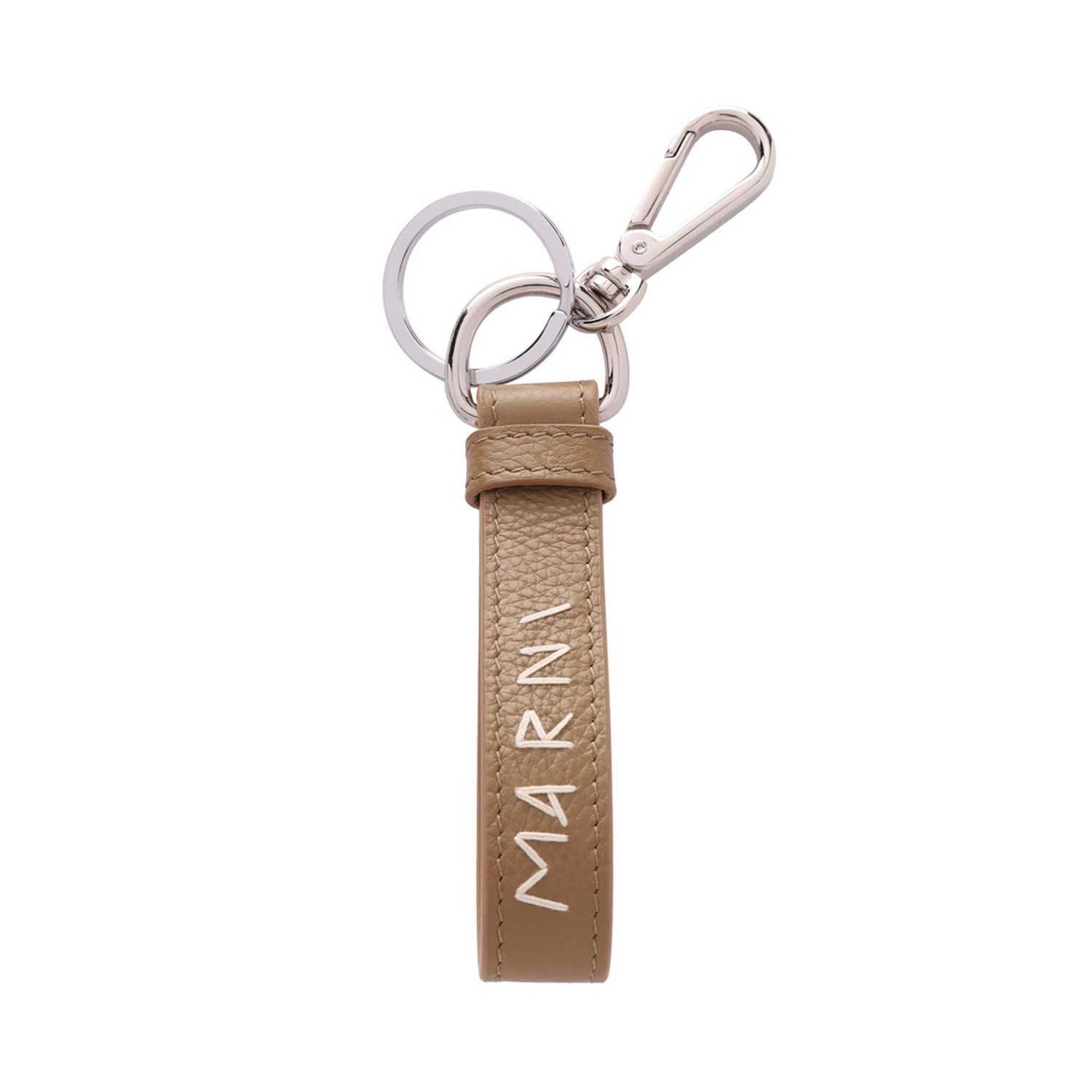 Marni Creta Logo Embroidered Keyring. Creta calf leather keyring with embroidered logo to the front, split-ring fastening and lobster claw fastening.