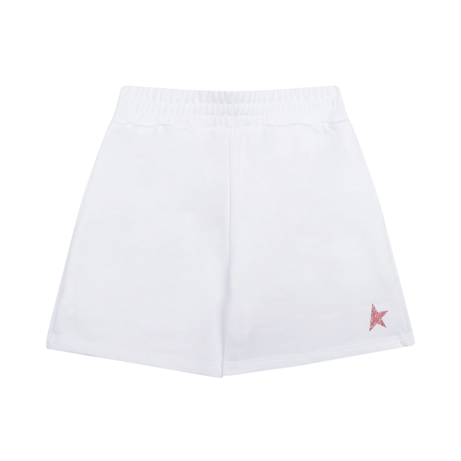 Golden Goose Kids White and Pink Cotton Star Print Shorts. White and pink cotton shorts, jersey knit, white star print, elastic waistband, slip-on style and thigh-lenght.