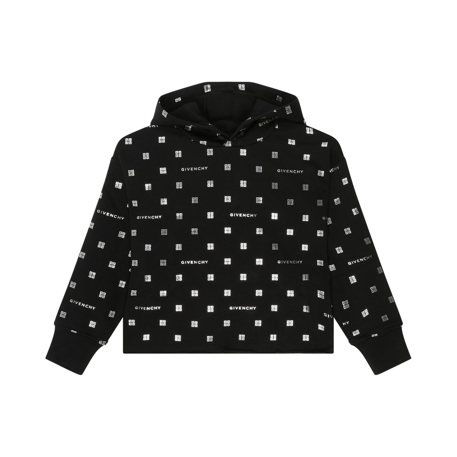 Givenchy Black Cotton Monogram Print Hoodie. Black cotto hoodie, all over monogram print, drawstring hood, metallic finish, long sleeves, drop shoulder, ribbed cuffs and raw cut hem.