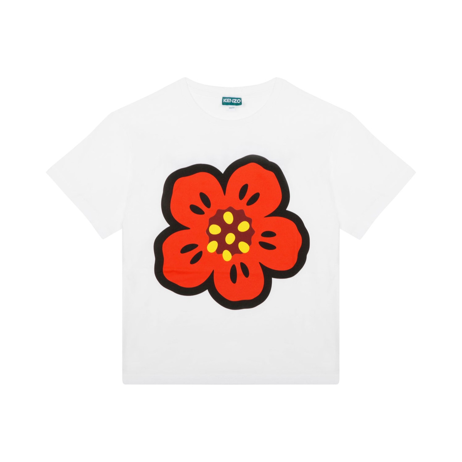 Kenzo Kids White Ikebana Iconic Boke T-Shirt. White cotton t-shirt, graphic print to the front, logo print to the rear. Signature Boke Flower motif, crew neck, short sleeves and straight hem.
