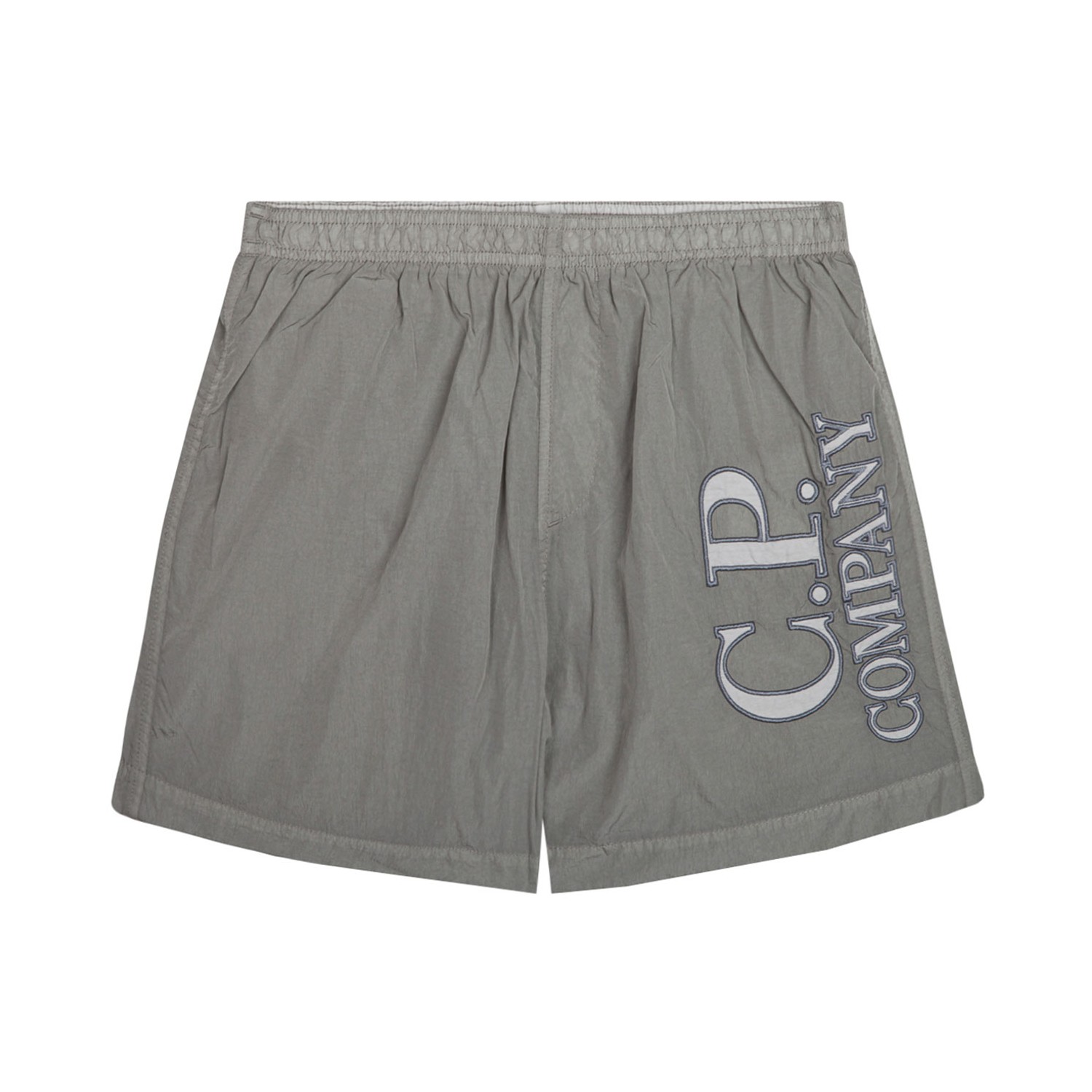 C.P. Company Kids Grey Swim Shorts. Grey swim shorts, crinkled finish, embroidered logo to the front, elasticated waistband. Rear zip fastening, staright leg.