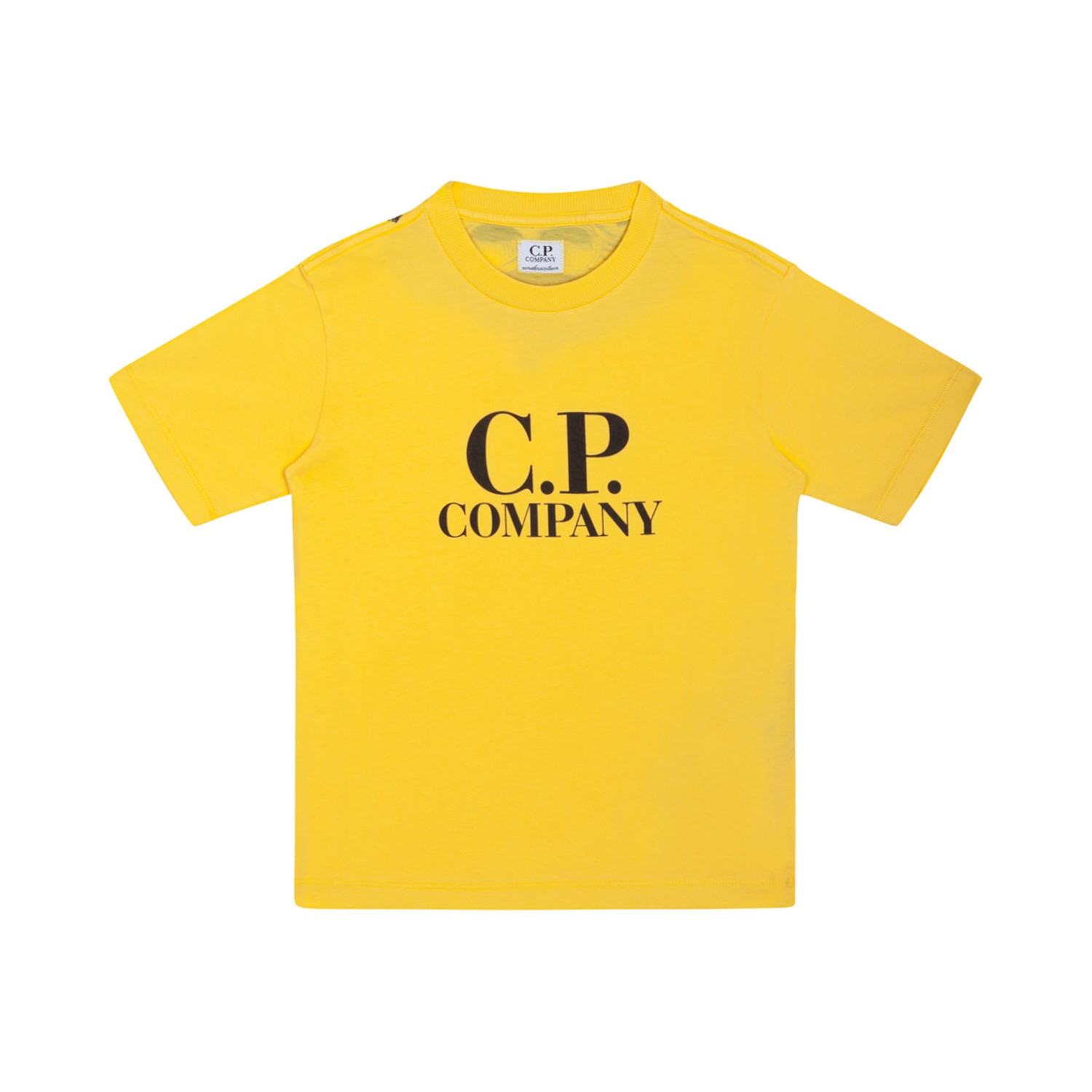 C.P. Company Kids Yellow T-Shirt. Yellow cotton t-shirt, jersey texture, ribbed crew neck. Short sleeves, logo print to the front, signature Goggles print to the rear and straight hem.