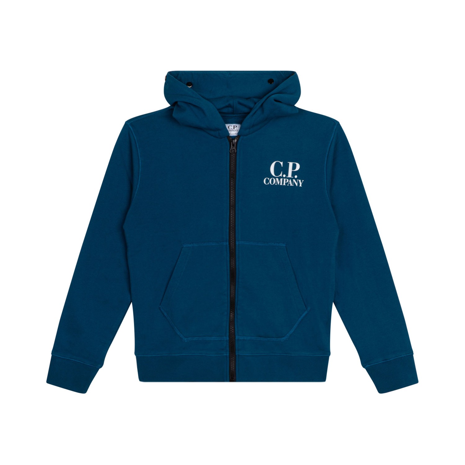 C.P. Company Kids Blue Oil Hoodie. Blue oil cotton hoodie, logo print at the chest, signature Googles detail, classic hoos. Long sleeves, ribbed cuffs and hem, two side slit pockets, straight hem and front zip fastening.