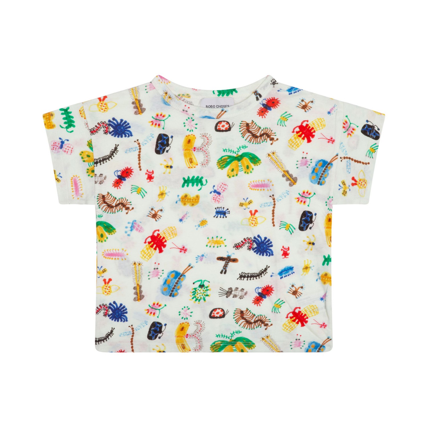 Bobo Choses Doodle Print T-Shirt. White and multicolour organic cotton t-shirt, lightweight jersey, illustration style print, crew neck. Short sleeves, unlined and straight hem.
