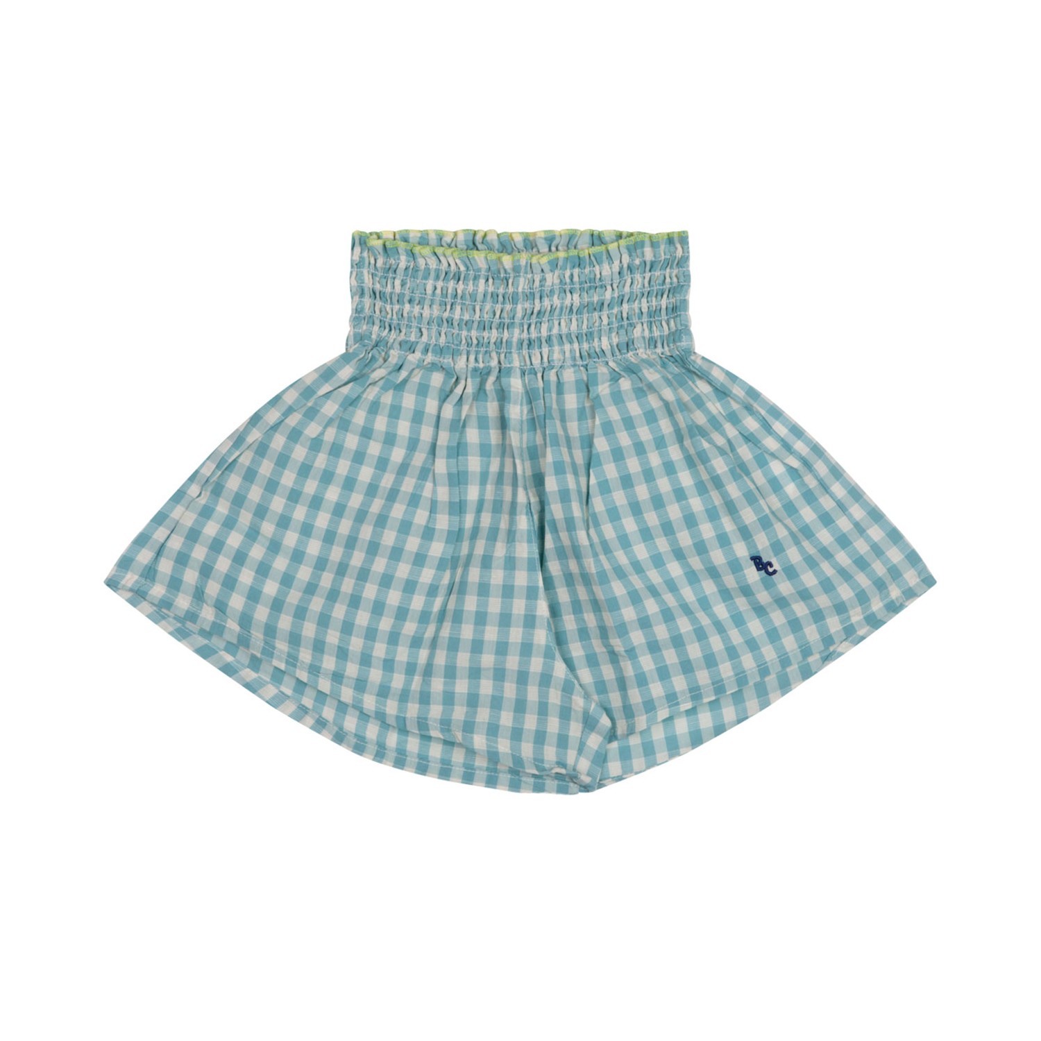 Bobo Choses Checked Shorts. Blue and white cotton linen blend shorts, elasticated smocked waist, embroidered logo to the rear, rear patch pocket, pull on style.