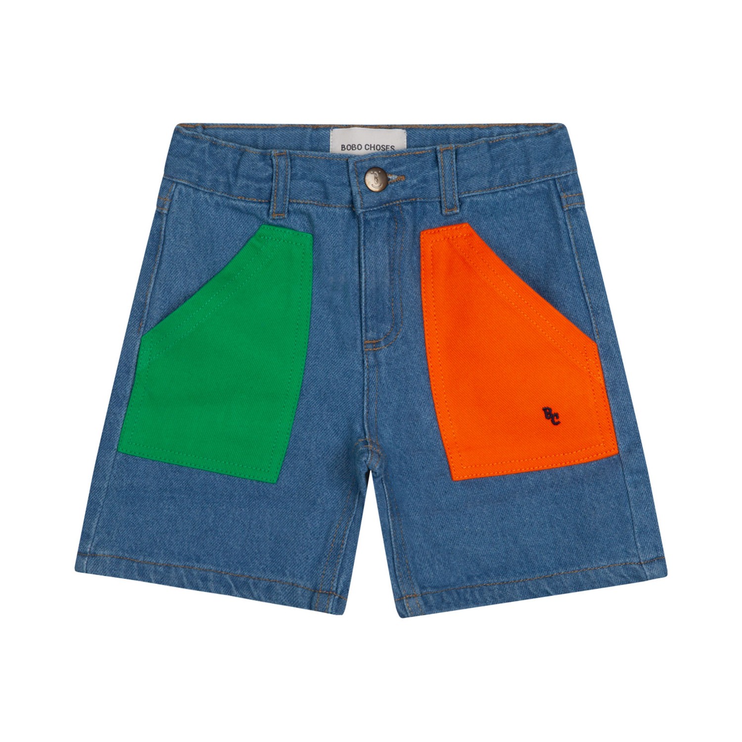 Bobo Choses Contrast Patch Denim Shorts. Blue, green and orange cotton blend denim shorts, colour block panelled design, embroidered logo to the side. Belt loops, front button and zip fastening, straight leg. Two front patch pockets, two rear patch pockets, straight hem, above knee length.
