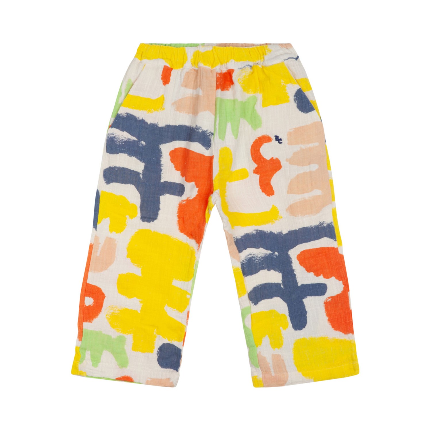 Bobo Choses Carnival Print Trousers. White and multicolour cotton trousers, all over abstract pattern print, embroidered monogram to the side. Elasticated waistband, two side inset pockets, straight hem, pull on style.