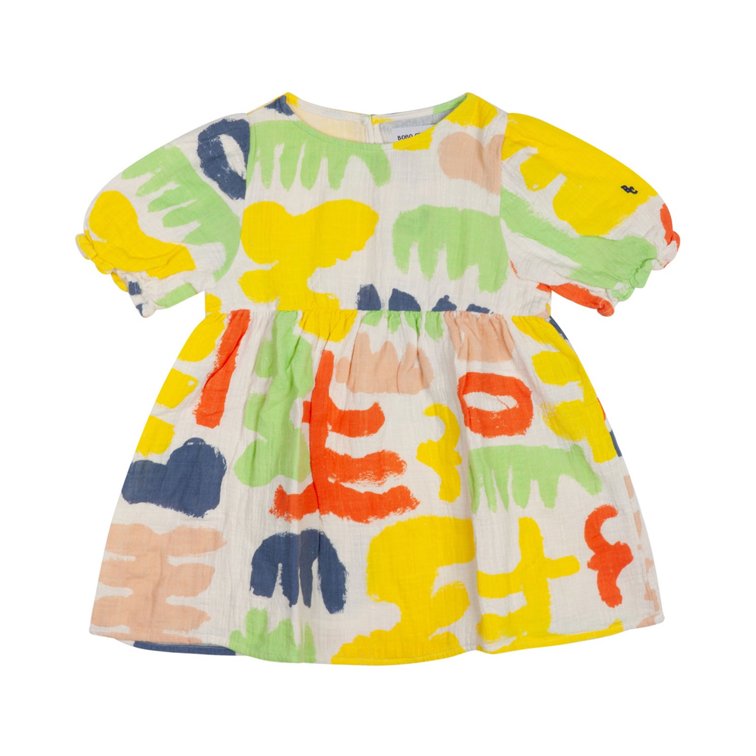 Bobo Choses Carnival Abstract Print Dress. White and multicolour cotton dress, seersucker texture, embroidered monogram at the sleeve, all over abstract pattern print. Round neck, short sleeves, elasticated cuffs, flared, rear button fastening.
