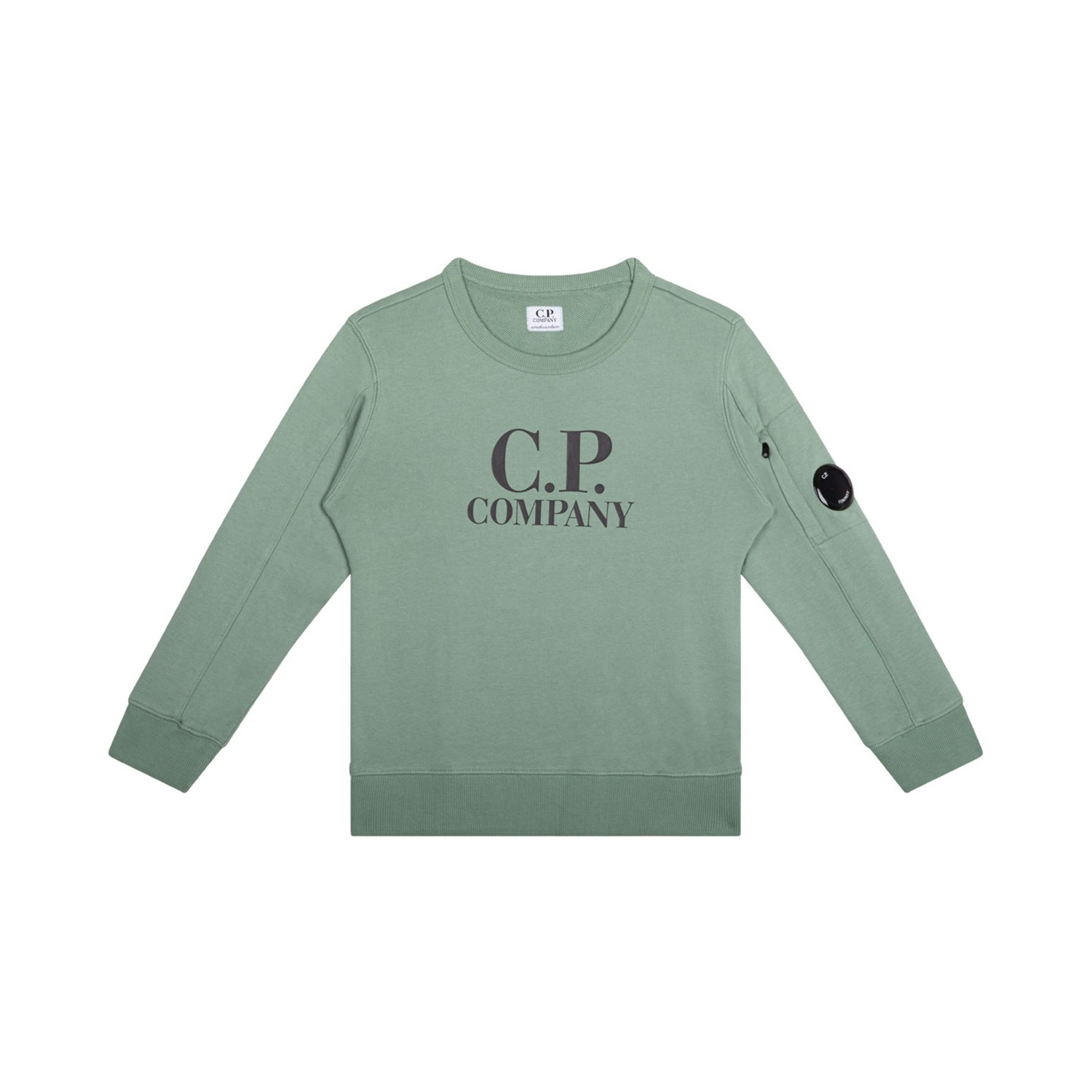 C.P. Company Kids Light Green Logo Print Sweatshirt. Light green cotton sweatshirt, jersey texture, logo print to the front. Crew neck, long sleeves, signature Goggles detail. Ribbed cuffs and hem, straight hem, French terry lining.