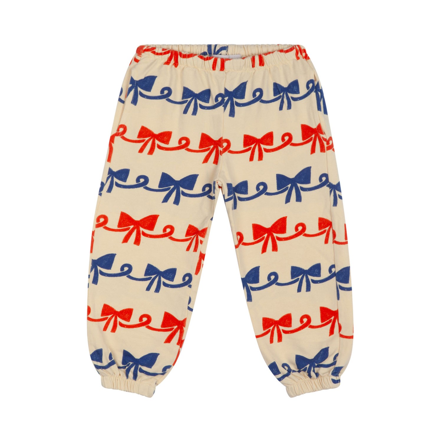 Bobo Choses Bow Print Trousers. Light yellow, blue and red organic cotton blend trousers, stratch design, jersey texture. Elasticated waistband with internal drawstring, two side inset pockets, bow print, elasticated ankles, rear patch pocket.