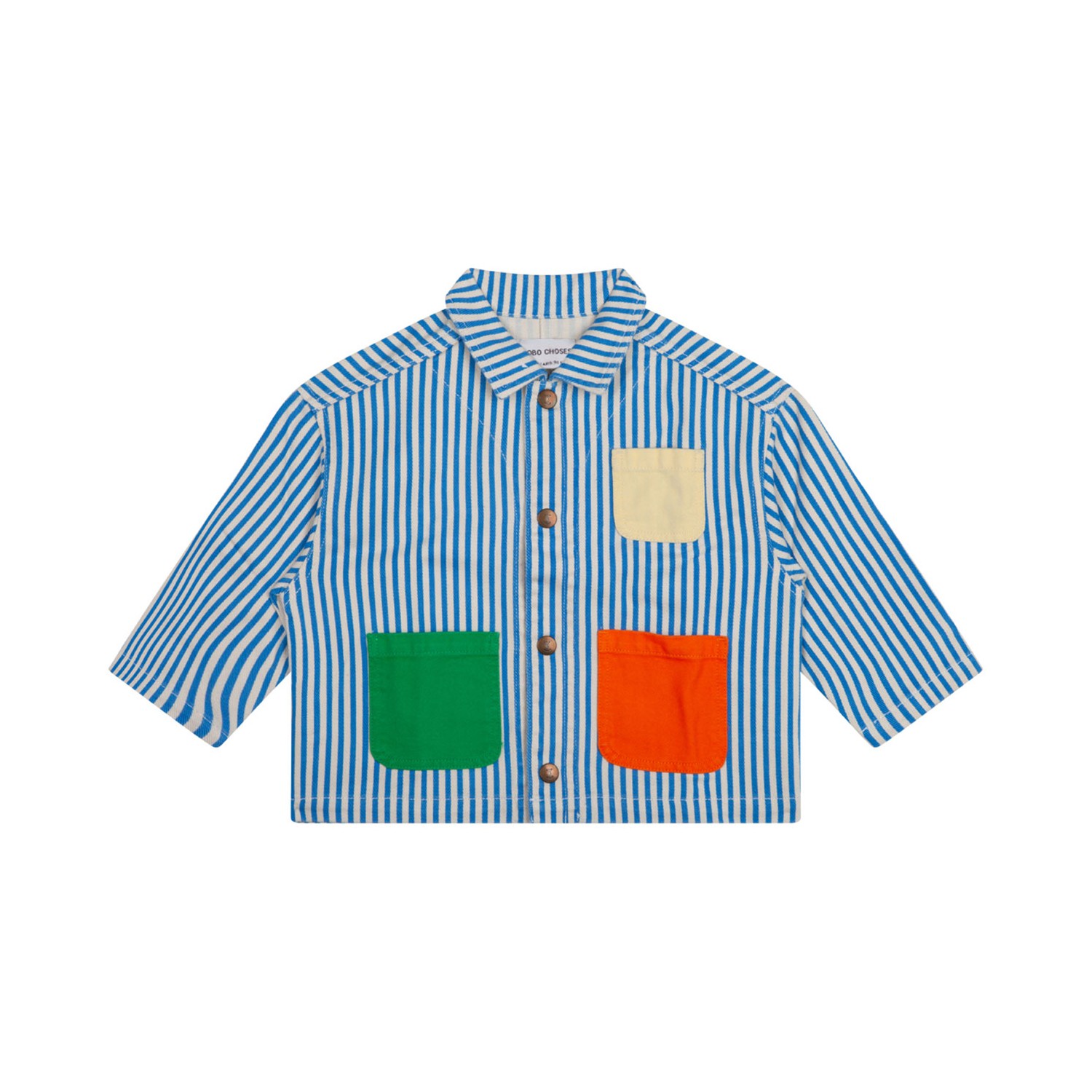 Bobo Choses Striped Denim Jacket. Multicolour cotton denim jacket, vertical stripe, classic collar, drop shoulder. Long sleeves, embroidered logo at the sleeve, multiple patch pockets, internal logo tag, straight hem, front button fastening.
