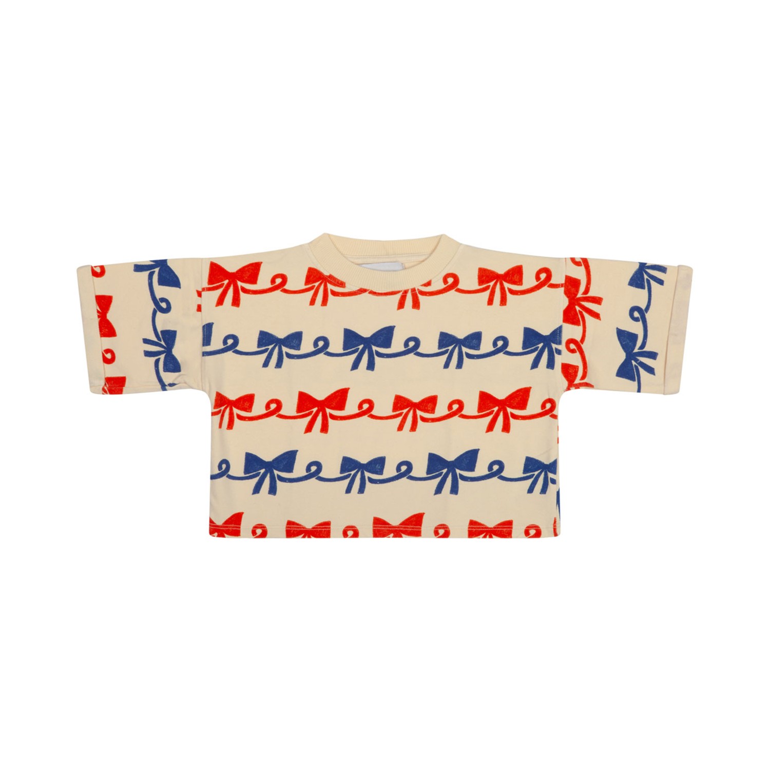 Bobo Choses Multicolour Ribbon Bow Sweatshirt. Beige and multicolour sweatshirt, short sleeves, all over ribbon bow, crew neck.