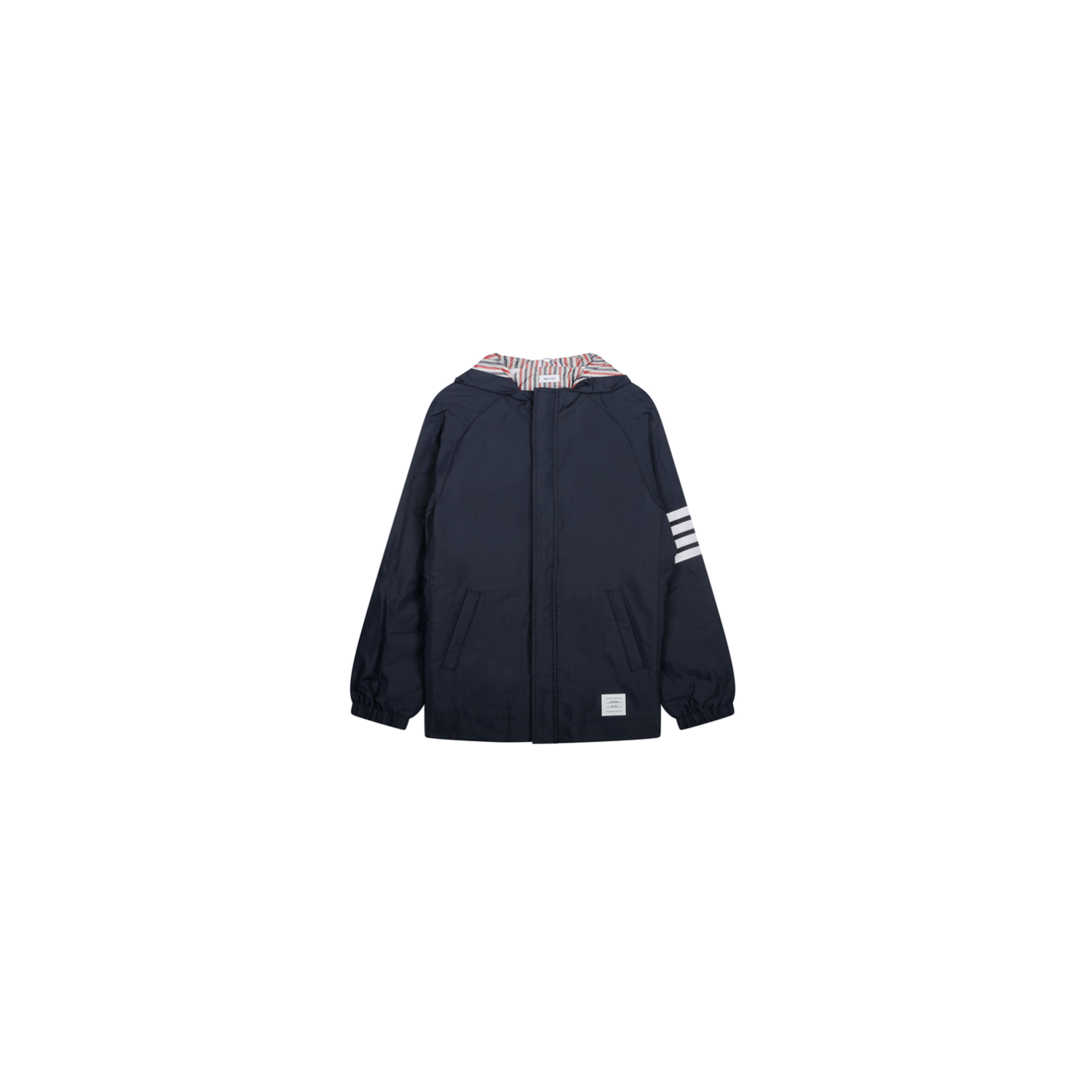 Thom Browne Dark Blue Hooded Jacket. Dark blue hooded jacket, front zip fastening, padded design, signature 4Bar stripe, long sleeves, slip pockets to the sides.