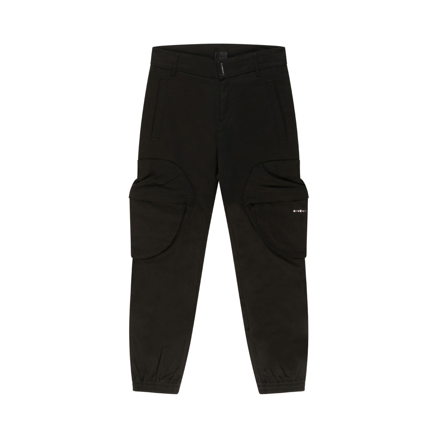Givenchy Kids Black Cotton Logo Plaque Gabardine Trousers. Black cotton trousers, gabardine weave, silver tone logo plaque and lettering, logo patch to the rear, signature 4G motif, belt loops, elasticated ankles, concealed front fastening. Two side slit pockets, two side zip-fastening pockets, two rear welt pockets.