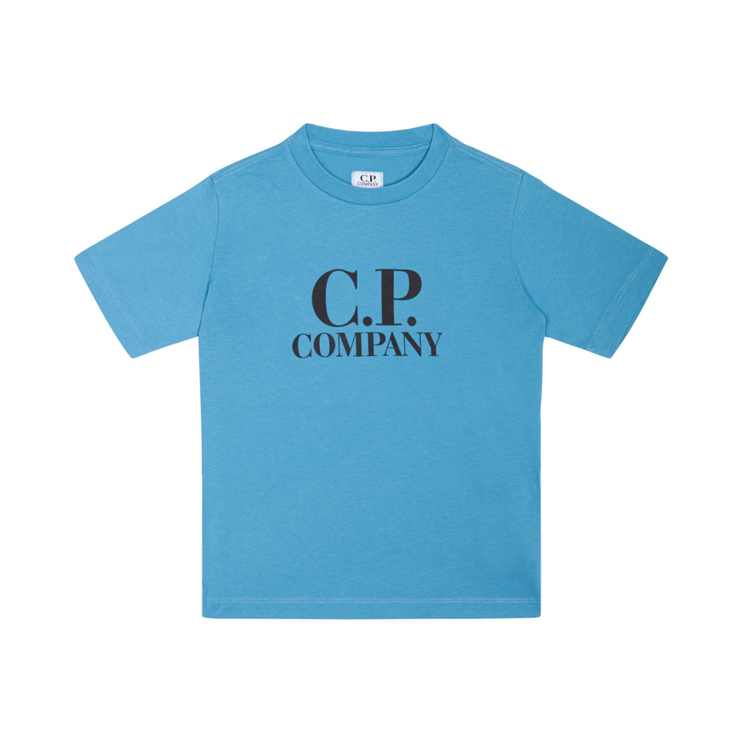 C.P. Company Kids Light Blue T-Shirt. Light blue cotton t-shirt, jersey texture, ribbed crew neck. Short sleeves, logo print to the front, signature Goggles print to the rear and straight hem.