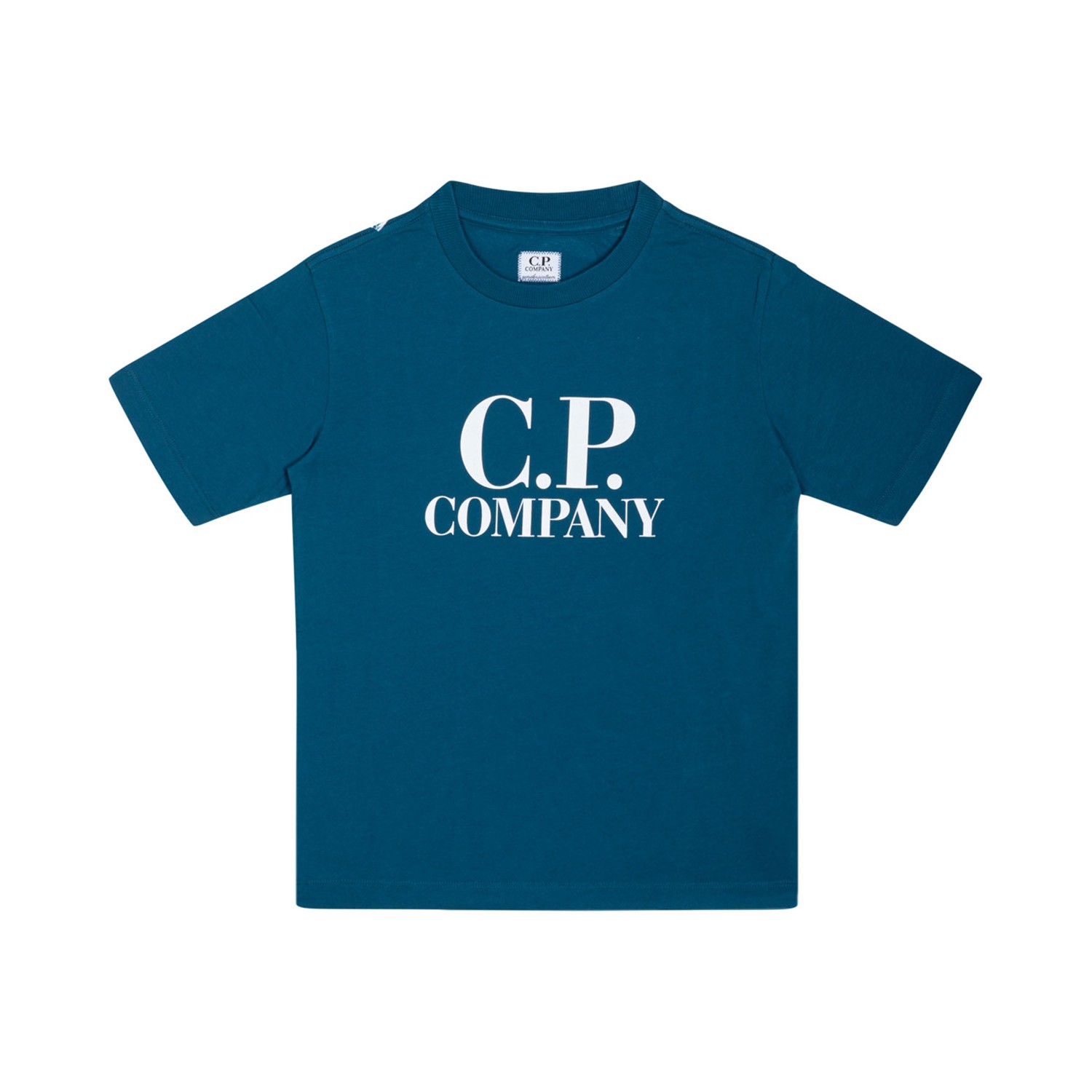 C.P. Company Kids Blue T-Shirt. Blue cotton t-shirt, jersey texture, ribbed crew neck. Short sleeves, logo print to the front, signature Goggles print to the rear and straight hem.