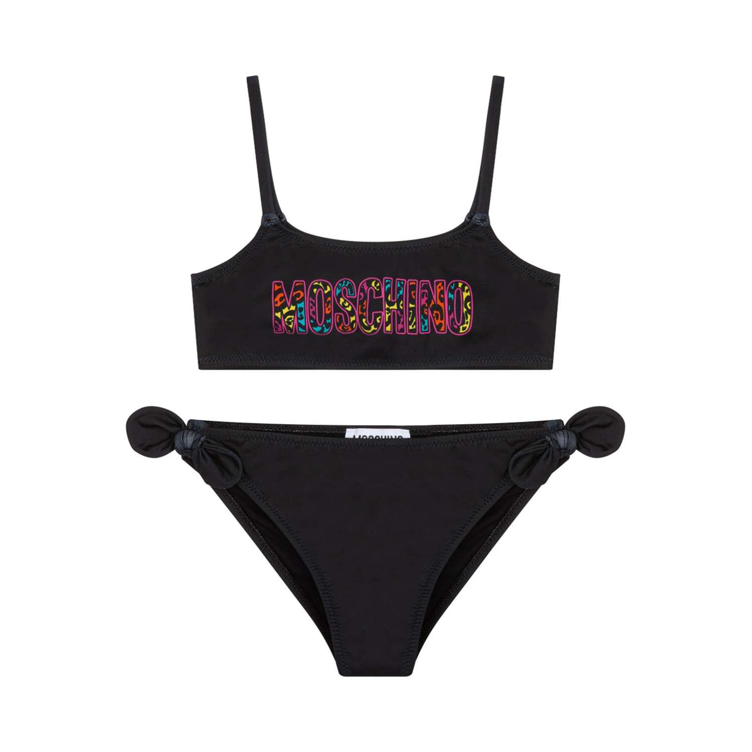 Moschino Black Bikini Set. Black stretch design bikini set, logo print to the front, animal print, bow detailing. Round neck, spaghetti straps, classic bottoms.
