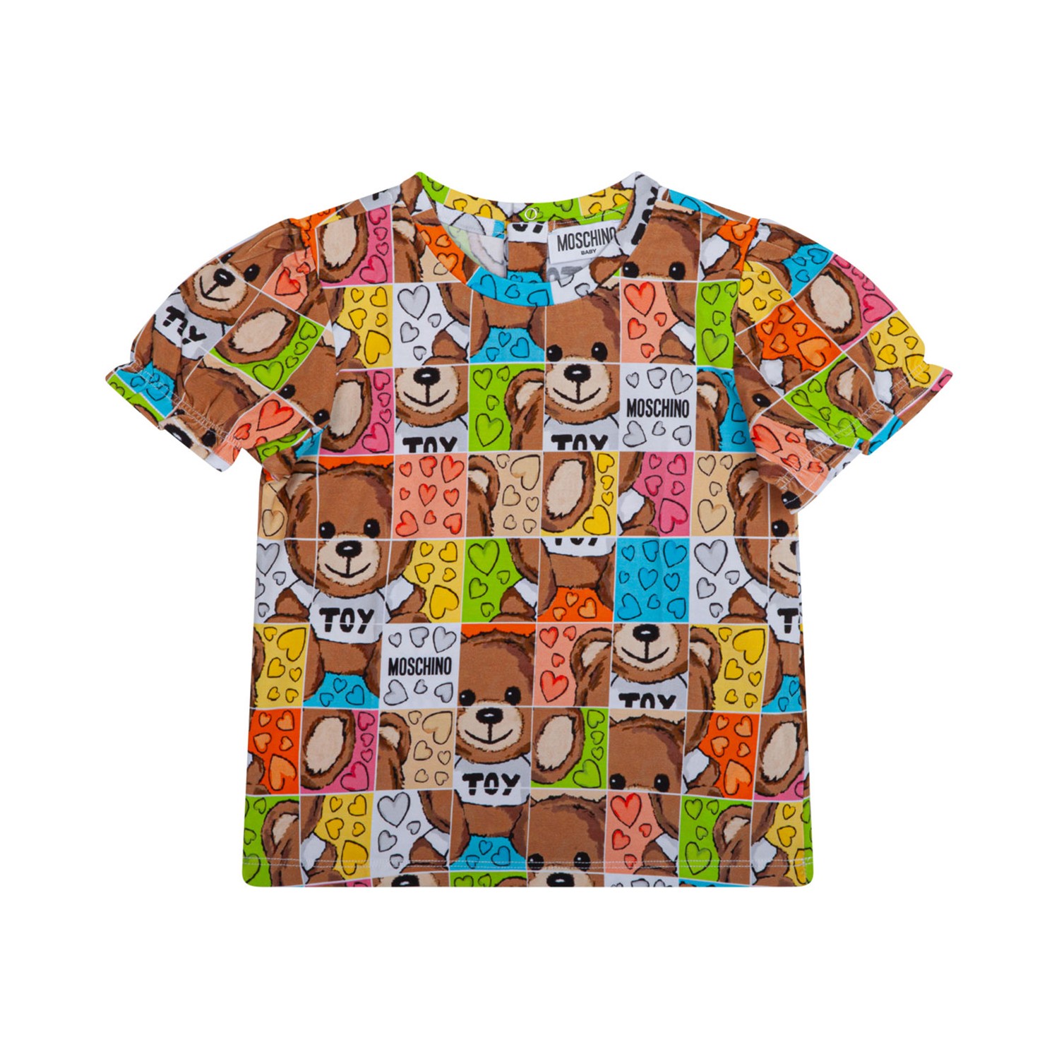 Moschino Kids Teddy Bear Short Set. Multicolour cotton-linen-lyocell blend set of two. T-Shirt: signature Teddy Bear motif, all over graphic print, round neck, rear press stud fatsening. Short sleeves, elasticated cuffs, ruffle cuffs, straight hem. Shorts: logo print at the leg, sequined heart print, contrast stitching, elasticated waistband, two side slit pockets, straight hem.